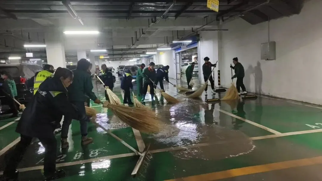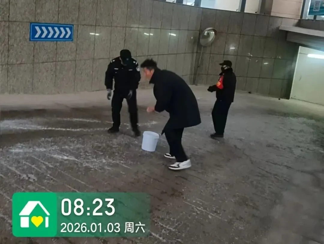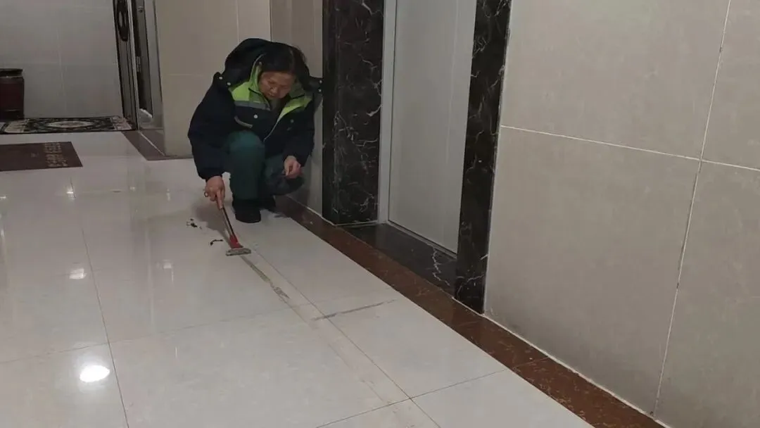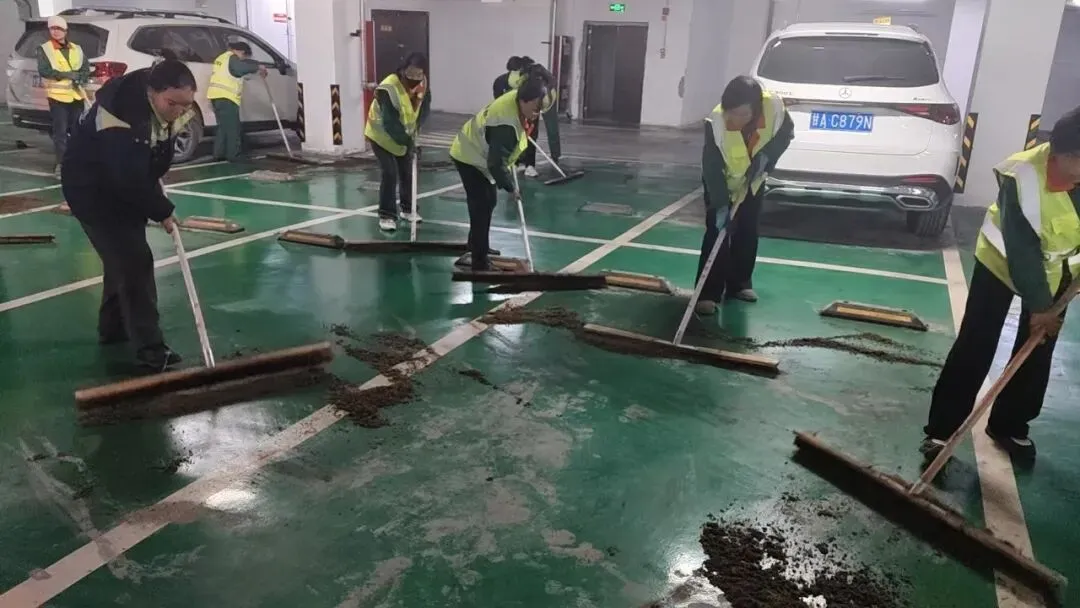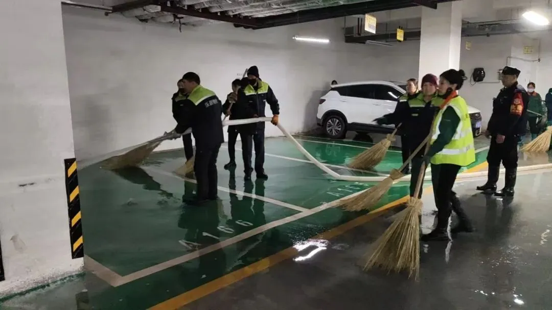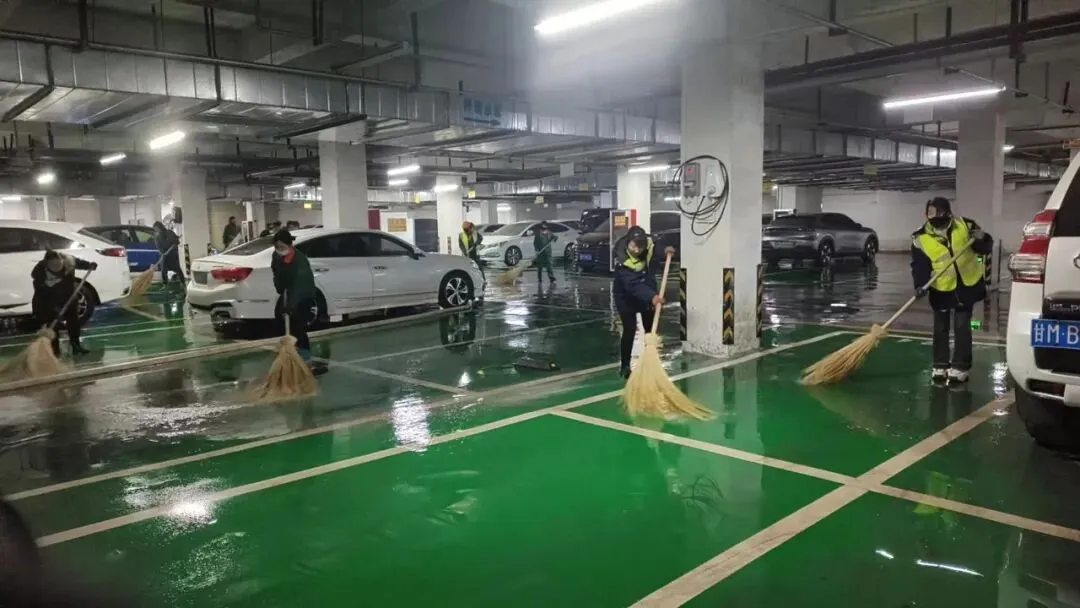 地面的冰雪尚未消融,地下车库的清洁工作也同步开启。面对潮湿的地面和残留的污渍,他们用拖把一遍遍拖洗,用抹布仔细擦拭每一处角落,确保车库整洁干爽,让业主停车时安心又舒心。