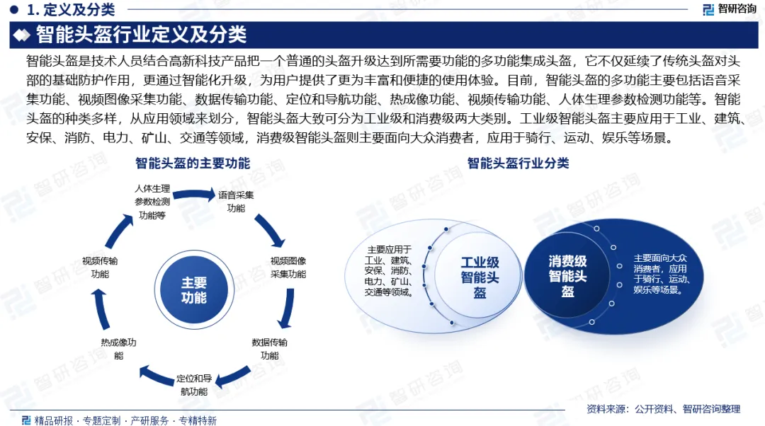 行业定义及分类:智能头盔是技术人员结合高新科技产品把一个普通的头盔升级达到所需要功能的多功能集成头盔。智能头盔的种类多样,从应用领域来划分,智能头盔大致可分为工业级和消费级两大类别。工业级智能头盔主要应用于工业、建筑、安保、消防、电力、矿山、交通等领域,消费级智能头盔则主要面向大众消费者,应用于骑行、运动、娱乐等场景。