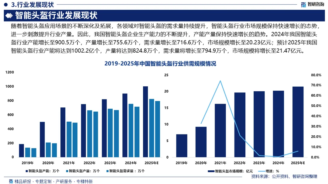 智能头盔是技术人员结合高新科技产品把一个普通的头盔升级达到所需要功能的多功能集成头盔,它不仅延续了传统头盔对头部的基础防护作用,更通过智能化升级,为用户提供了更为丰富和便捷的使用体验。随着智能头盔应用场景的不断深化及拓展,各领域对智能头盔的需求量持续提升,智能头盔行业市场规模保持快速增长的态势,进一步刺激提升行业产量。因此,我国智能头盔企业生产能力的不断提升,产能产量保持快速增长的趋势。2024年我国智能头盔行业产能增长至900.5万个,产量增长至755.6万个,需求量增长至716.6万个,市场规模增长至20.23亿元;预计2025年我国智能头盔行业产能将达到1002.2亿个,产量将达到824.8万个,需求量将增长至794.9万个,市场规模将增长至21.47亿元。