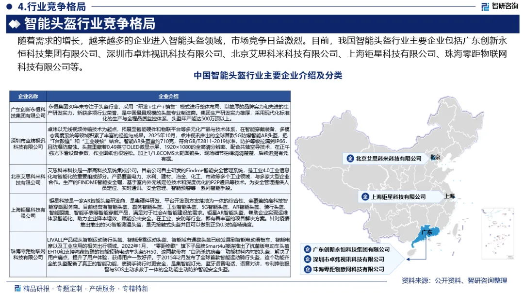 竞争情况:随着需求的增长,越来越多的企业进入智能头盔领域,市场竞争日益激烈。目前,我国智能头盔行业主要企业包括广东创新永恒科技集团有限公司、深圳市卓炜视讯科技有限公司、北京艾思科米科技有限公司、上海钜星科技有限公司、珠海零距物联网科技有限公司等。