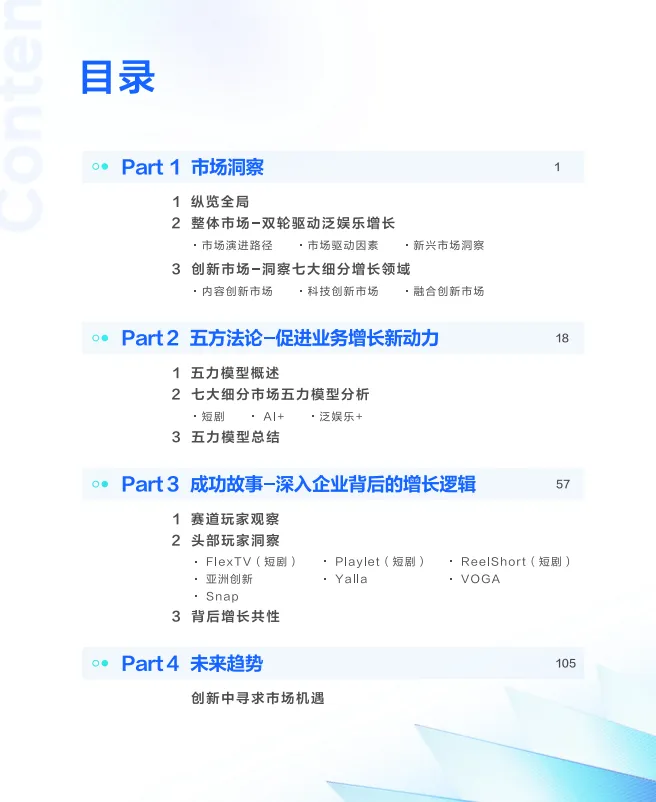 《2024泛娱乐出海白皮书》聚焦短剧、AI 虚拟人、社交 + 等七大细分领域,全球社交应用市场规模预计 2030 年超 3100 亿美元。报告重点提出 “五力模型” 方法论,头部企业靠本地化与技术创新突围。