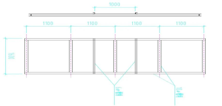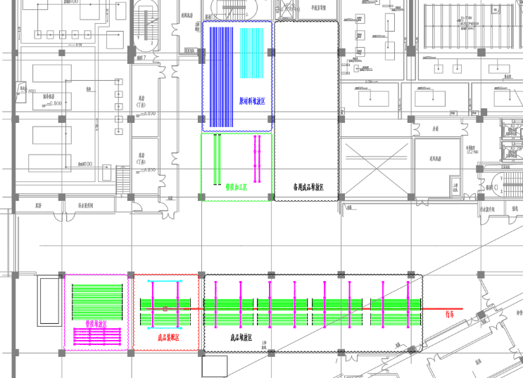 模块预制区域为A-J~L交A-4~6的加工区域;堆放区域为A-G~H交A-4~7。模块组件在加工车间内预制完成后,在制作好的组装架上进行组装;组装完成后利用组装架上空安装好的电葫芦及导轨转运至旁边的堆放架上。