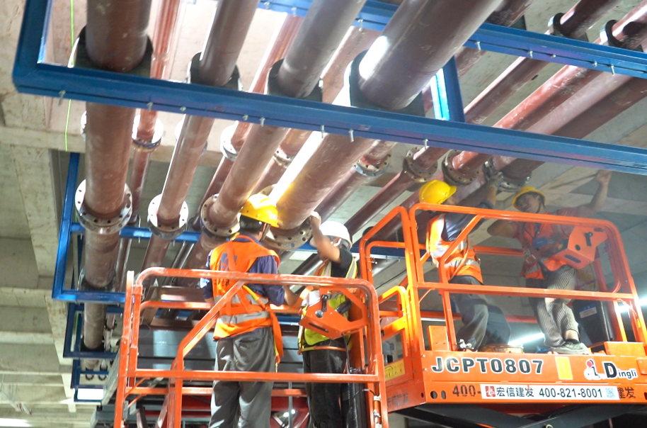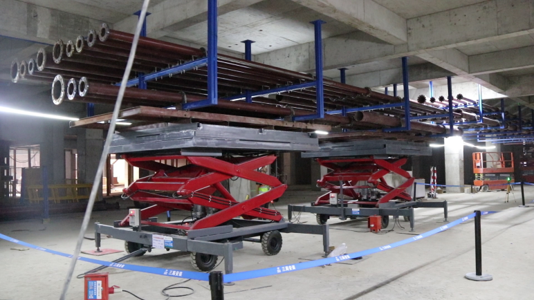 目前常规的机电综合管线安装,主要是通过高处作业来逐个系统进行拼装,不仅多专业交叉施工,工效极低,且无法保证施工质量及施工安全。为此,中建三局安装工程有限公司在浦东新区新场综合医疗卫生项目上,采用了一种功效高、精度高、利用率高的装置来进行综合管线的整体抬升技术。