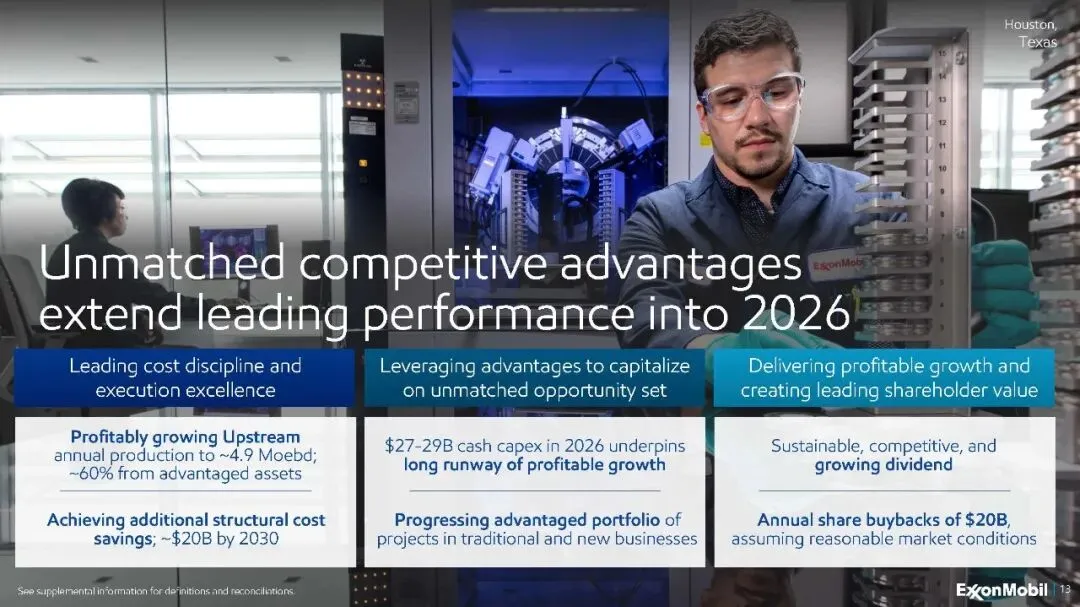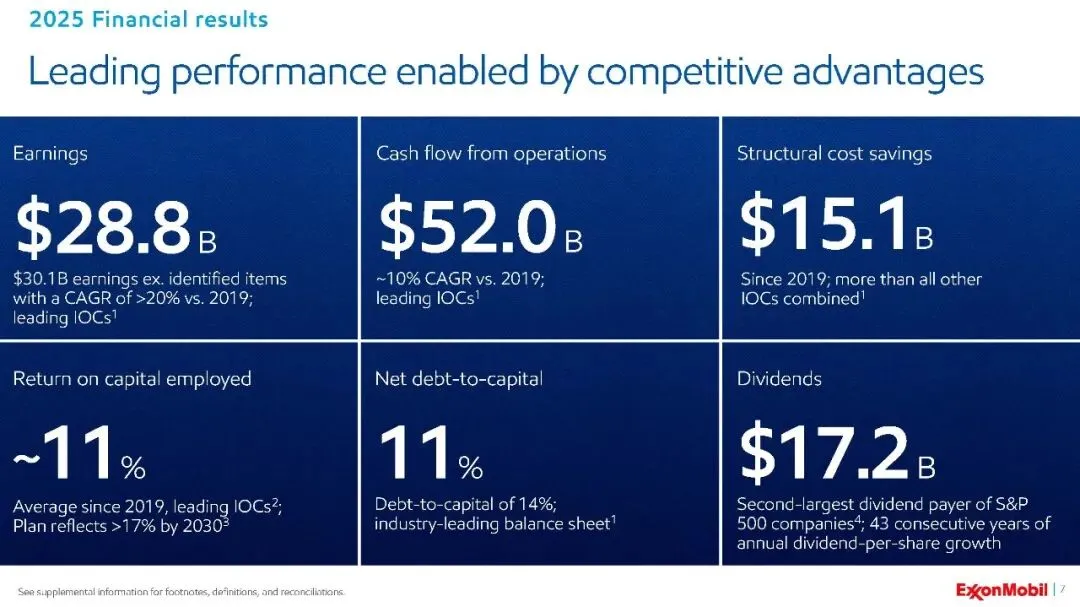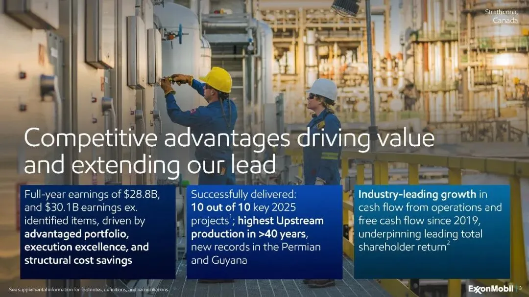 埃克森美孚2025年的业绩充分展示了其战略转型的成效。通过聚焦优势资产、优化产品组合、持续降低成本并投资于未来增长引擎,公司不仅实现了创纪录的运营表现,更构建了更具韧性和盈利能力的业务模式。在能源转型和市场竞争加剧的背景下,埃克森美孚凭借其强大的执行能力、财务纪律和清晰的增长路线图,正努力确保其在未来能源格局中的持续领先地位,并为股东创造长期价值。该公司计划于2026年2月20日发布更新的概述演示文稿,为投资者提供更深入的战略洞察。