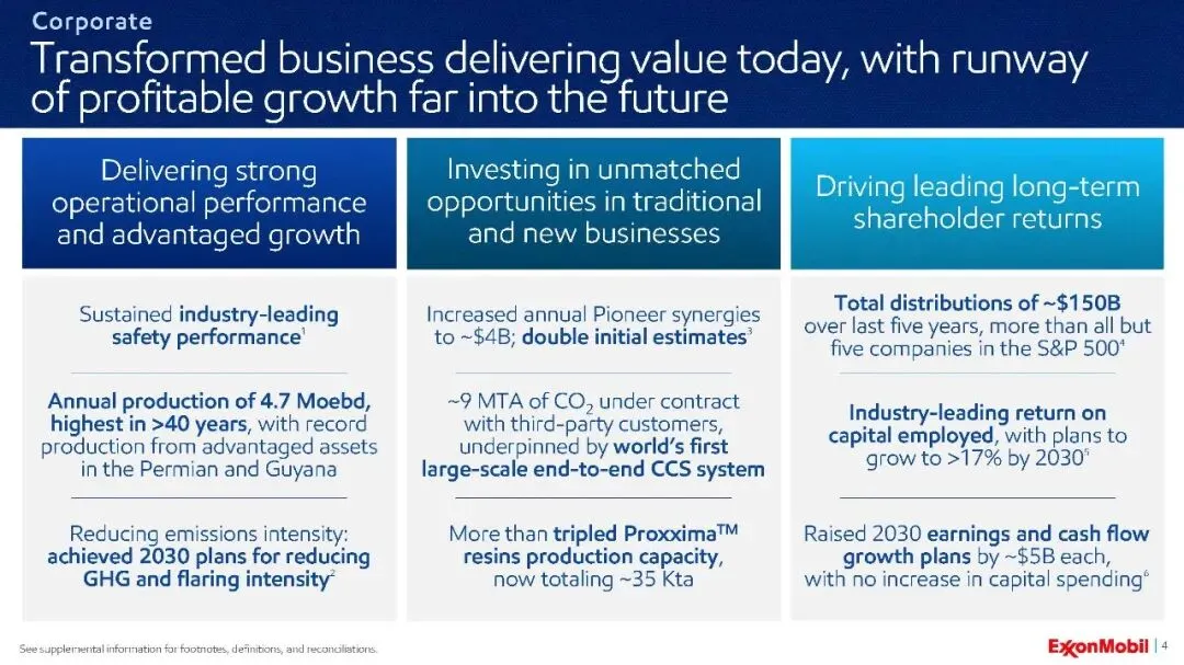 埃克森美孚近年来的核心主题是“转型”。管理层强调,公司已从根本上进行了重塑,这不仅体现在财务数字上,更体现在业务质量和盈利韧性上。