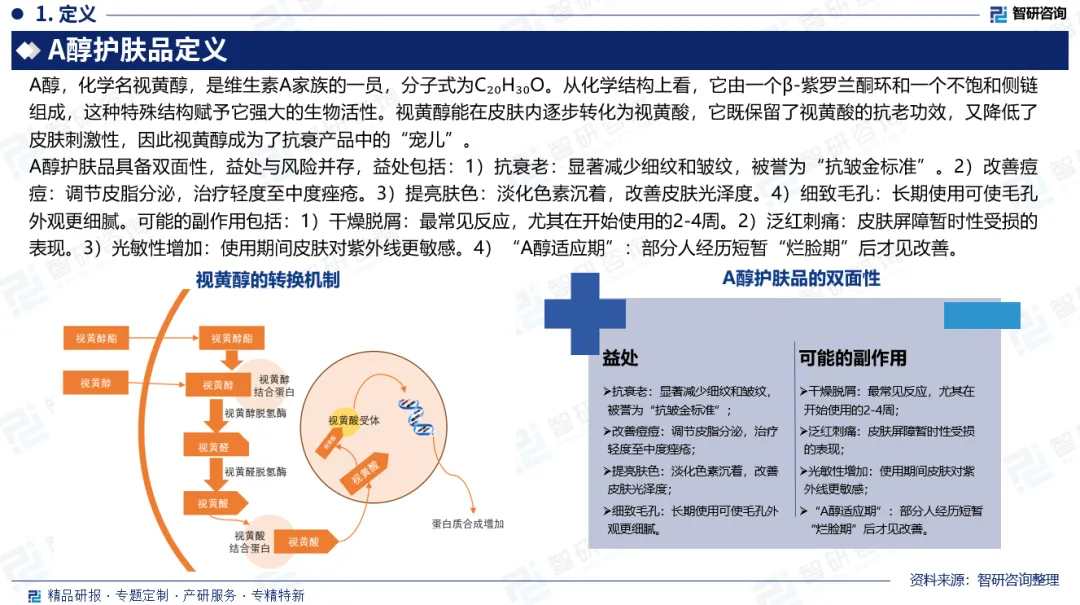 发展趋势:1)A醇护肤品市场规模稳步增长;2)配方科技升级,低刺激高效并重;3)科研驱动发展,功效验证与标准建设并行;4)国货崛起,本土创新加速突围