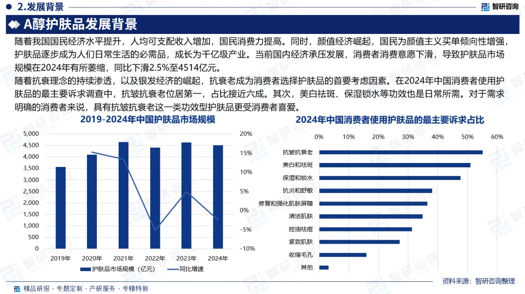 发展背景:随着抗衰理念的持续渗透,以及银发经济的崛起,抗衰老成为消费者选择护肤品的首要考虑因素。在2024年中国消费者使用护肤品的最主要诉求调查中,抗皱抗衰老位居第一,占比接近六成。其次,美白祛斑、保湿锁水等功效也是日常所需。对于需求明确的消费者来说,具有抗皱抗衰老这一类功效型护肤品更受消费者喜爱。