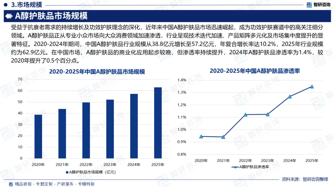 市场规模:A醇护肤品正从专业小众市场向大众消费领域加速渗透,行业呈现技术迭代加速、产品矩阵多元化及市场集中度提升的显著特征。2020-2024年期间,中国A醇护肤品行业规模从38.8亿元增长至57.2亿元,年复合增长率达10.2%,2025年行业规模约为62.9亿元。