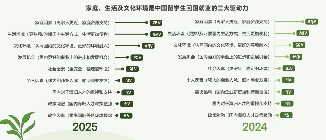 报告显示,「家庭因素」(离家人更近、家庭资源支持)以高达65%的比例,与「生活文化环境」(65%)并列成为留学生归国的首要动因。这标志着情感归属和文化认同在决策天平上的权重长至高点——在不久远的几年前,同样的现象并不是出于这样的原因,而目前,这样的决策点被视为一种远见的决策。