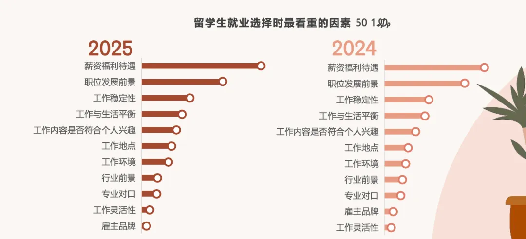 在具体的择业选择上,2025届留学生归国择业考虑的前五大因素仍为薪资福利待遇、职位发展前景、工作稳定性、工作生活平衡以及工作性质与个人志趣的契合。这种理性和多元化,类似于「精明的投资者」,在不同选项间分散风险、寻求长期回报。