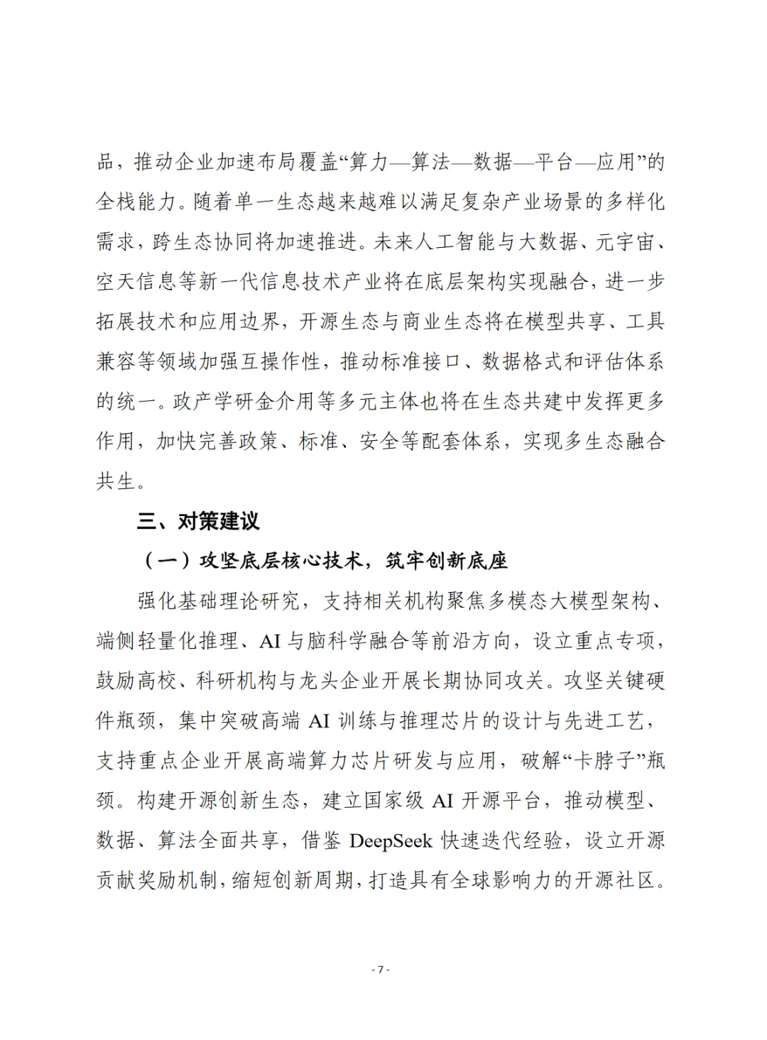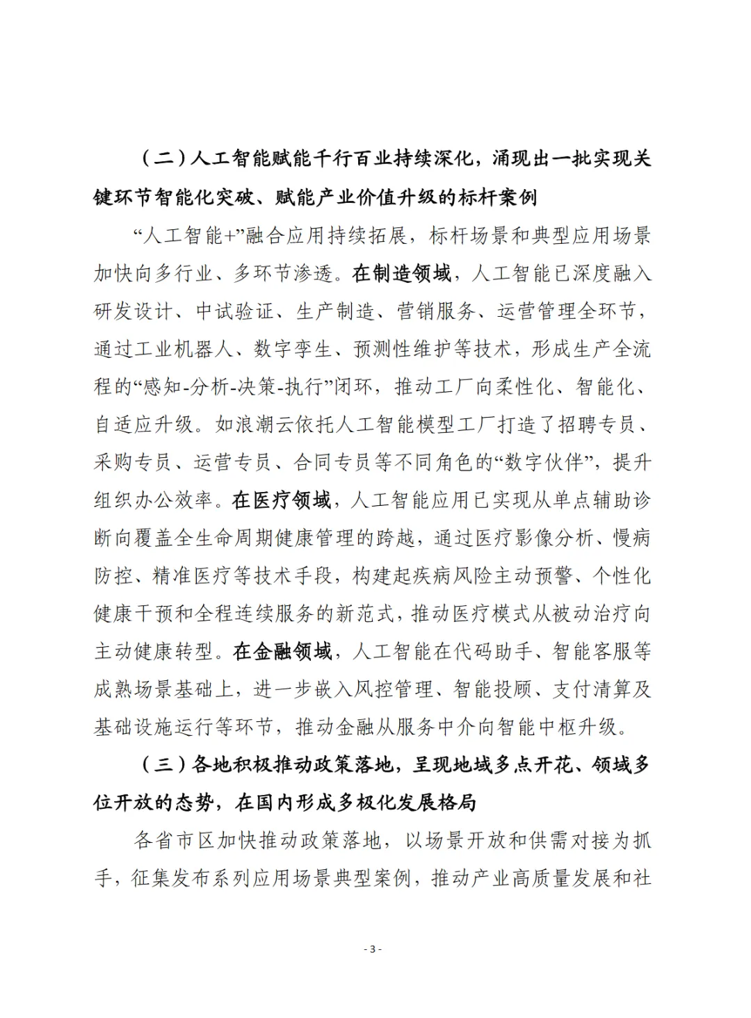 本篇行业报告可以通过扫下方知识星球下载。39元就可以下载星球所有报告。免费提供报告查找服务。随着我国人工智能产业的蓬勃发展,“人工智能+”行动正深入经济社会发展的各个领域。2025年以来,我国在AI生态和创新实力上实现了跨越式跃升,形成了规模领先、链条完整、技术引领的全球产业高地。这一进步不仅体现在产业规模的增长和企业数量的增加,更在于技术创新的活跃和全球话语权的增强。在赋能千行百业方面,人工智能已深度融入各行业的全流程,推动产业价值升级。例如,在制造业中,通过工业机器人、数字孪生等技术,实现生产全过程的智能化管理;在医疗领域,AI技术的应用从辅助诊断扩展到全生命周期健康管理;金融领域则通过智能客服、风控管理等技术,推动金融服务向智能中枢升级。各地政策的积极推动,使得“人工智能+”行动在国内形成多极化发展格局,地域多点开花、领域多位开放。广东、浙江、广西等省份通过发布应用场景清单,推动产业高质量发展和社会治理水平提升。面对未来,我国“人工智能+”行动呈现出四大趋势:技术升级持续加快,智能原生业态快速成熟;企业应用向纵深发展,更加关注价值提升;竞争路径差异化,应用场景成为竞争的核心战场;产品向全栈化转变,多生态融合加速完善。为应对这些新变化,建议持续攻坚底层核心技术,筑牢创新底座;加强生态深度合作,挖掘应用场景;优化协同支持机制,完善商业模式;提升资金人才供给,强化要素保障。通过这些对策,我国将能够更好地推动人工智能技术的发展和应用,为经济社会发展注入新动能。免责声明:以上分享报告为公开合法渠道获得,内容大部分来源于网络,版权归原作者所有,如有侵权,请及时与我们联系,我们将第一时间保障您的权益。推荐内容仅供参考学习,不构成投资建议。