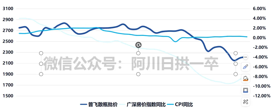从茅台普飞的批发价格也能看出来,从股价高点开始就一直在走低。