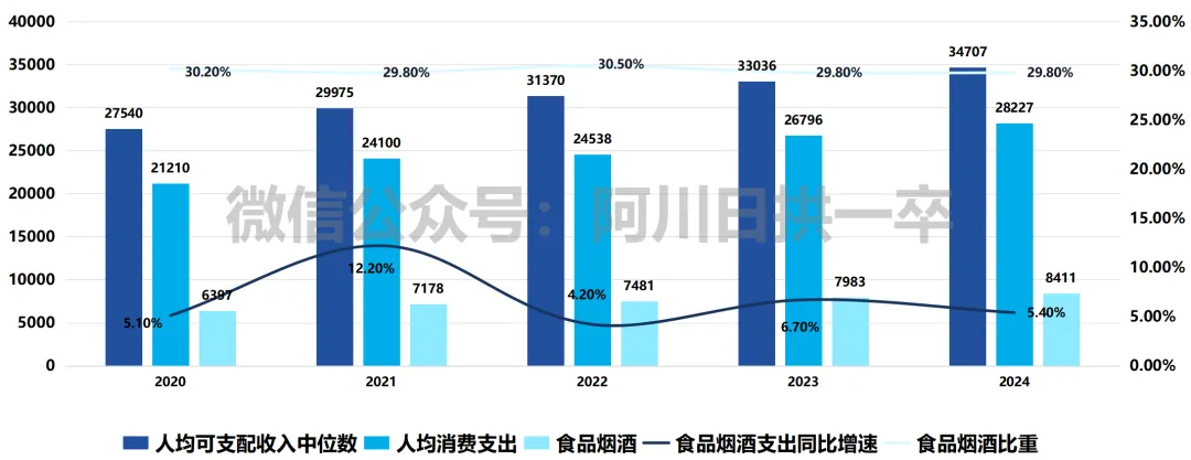 而近几年食品烟酒支出同比增速,平均有6%+,甚至略高于收入和消费支出的增速。