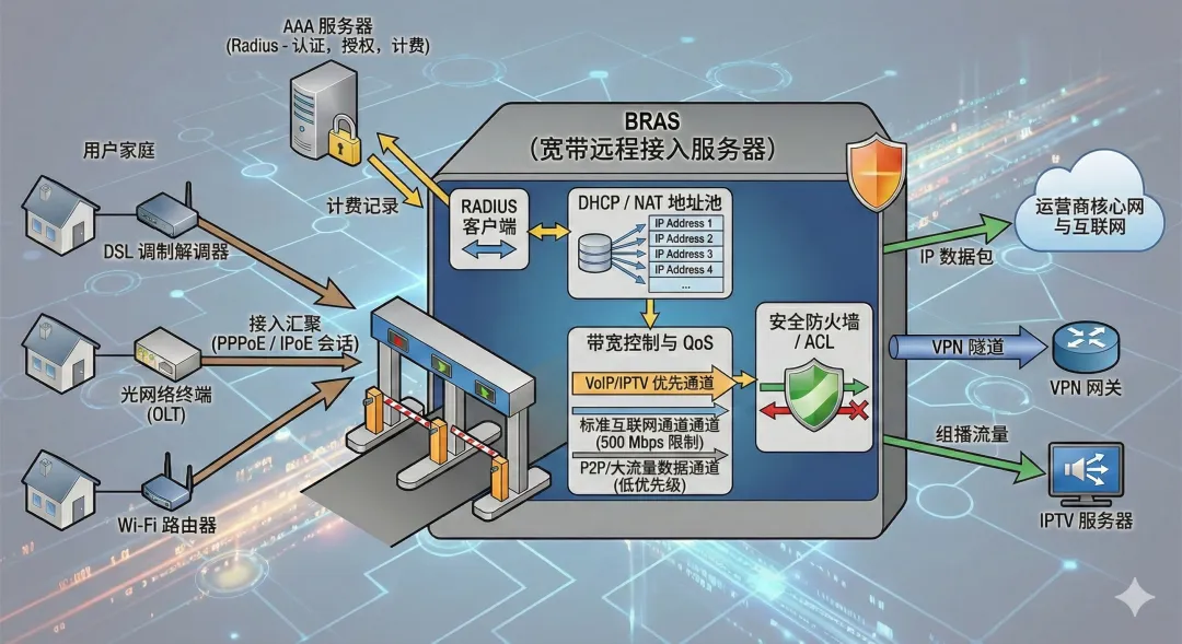 通过这些功能,BRAS不仅实现了用户接入的控制和管理,还为网络运营商提供了灵活的业务部署和管理能力,成为现代宽带网络不可或缺的核心组件。