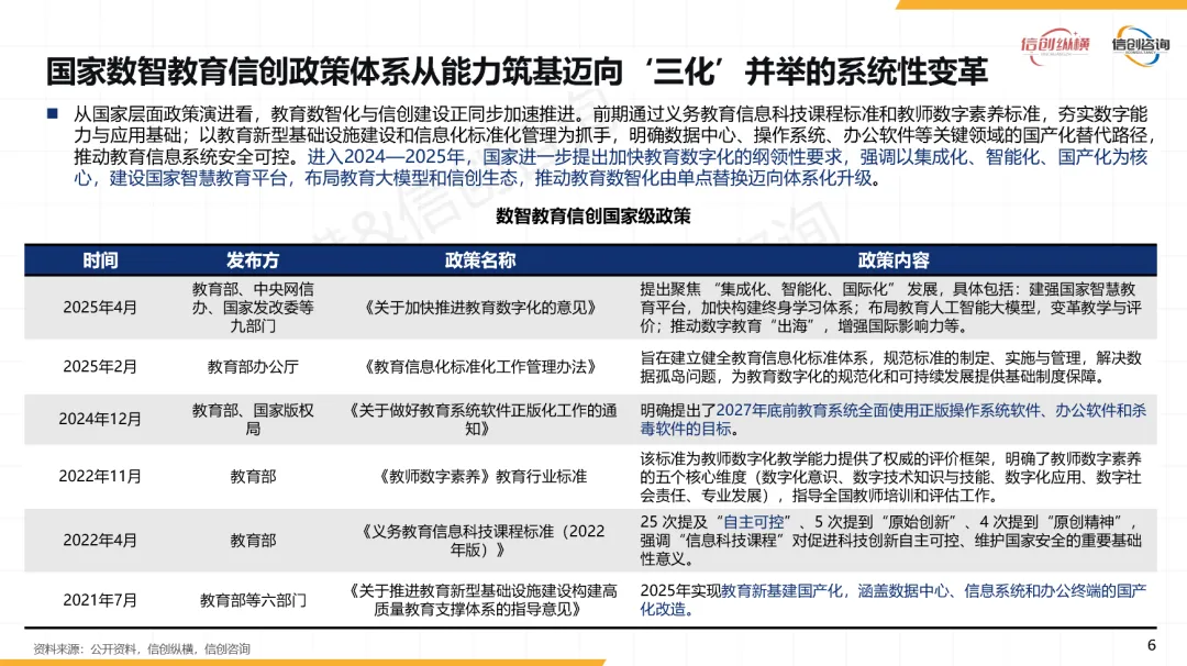 编者按:近日,《2025年数智教育信创研究报告》重磅发布!报告全面系统梳理了当前数智教育建设中政策、技术、应用等维度的信创最新进展,深入剖析教育信创发展路径,为各方提供决策参考,彰显教育信创市场增长潜力。更多内容,请点击文末“阅读原文”下载该信创报告完整电子版,关注信创纵横公众号,后台回复“信创纵横”获取更多信创相关报告。