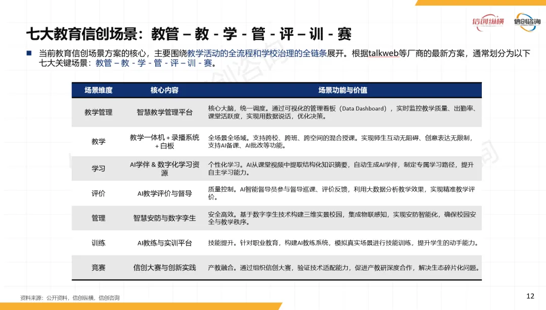 在应用层面,教育信创已逐步形成围绕教学全流程与学校治理全链条的典型场景体系。一方面,智慧教学与管理一体化平台通过数据贯通与AI底座,实现“教、评、学、管”协同运行,推动教学组织方式和治理模式升级;另一方面,信创实训平台与教育信创大赛的兴起,正在加速国产技术从可用走向好用。特别是在“AI + 国产算力”深度融合的推动下,教育信创正逐步成为产教融合和人才培养的重要基础设施。