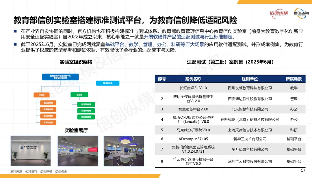 长期以来,生态碎片化是制约教育信创规模化落地的重要因素。报告指出,当前产业界正通过应用适配联盟、信创实验室及专业组织等方式,构建标准化、可复制的一站式服务体系。以教育信创实验室为代表的测试与认证机制,正在有效降低学校选型与适配风险;而应用适配联盟与行业组织的成立,则推动教育信创从单兵作战走向系统协同,为规模化推广创造条件。
