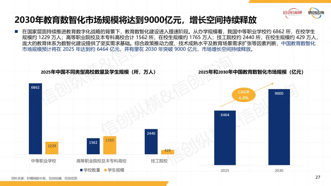 从市场规模看,庞大的教育体系为数智化建设提供了坚实需求基础。报告测算显示,2025 年我国教育数智化市场规模约为6464亿元,预计到2030年将突破9000亿元,长期增长趋势明确。与此同时,教育信创正与 AI、大模型等前沿技术深度融合,逐步嵌入教学创新、学习分析、教育评价与治理体系之中,成为支撑教育高质量发展的关键基础设施。