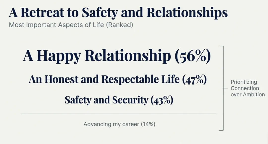 那他们在乎什么? 56% 的人选了“幸福的关系”,43% 的人选了“安全与稳定”。
