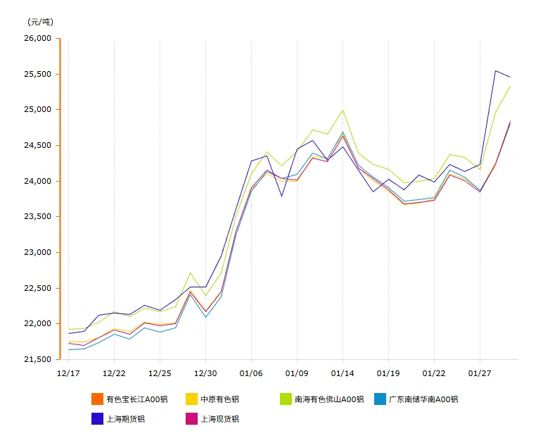 图为2025年12月中旬至今铝价走势