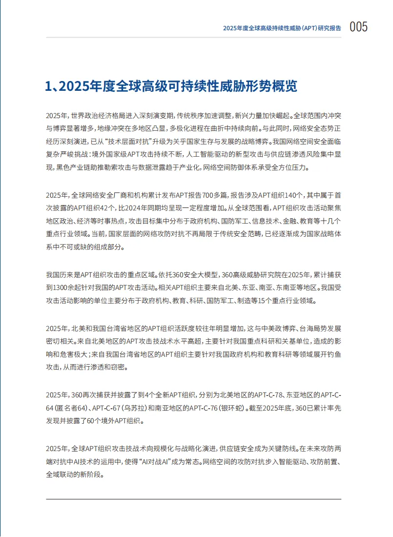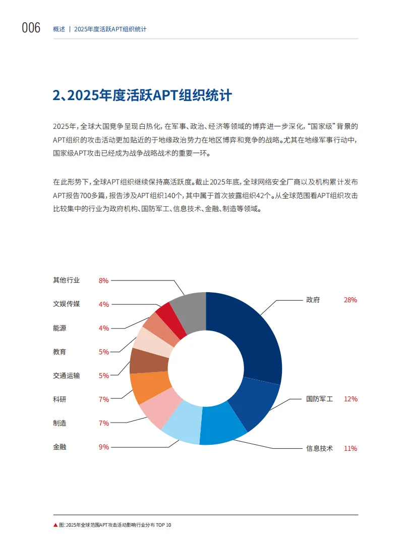 2025年,全球政治经济格局深度调整,地缘博弈加剧,网络安全态势升级为国家战略层面的博弈。全球网络安全厂商和机构累计发布APT报告700多篇,涉及140个APT组织,其中42个为首次披露,APT攻击活动呈现规模化、战略化特征。
