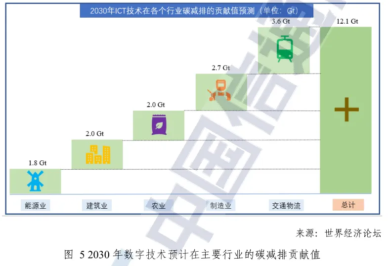 据世界经济论坛的数据显示,到2030年,各行业受益于ICT技术所减少的碳排放将达到121亿吨。通过在能源、制造业等行业应用5G、云计算、物联网、人工智能等数字化解决方案,可减少全球15%的碳排放。