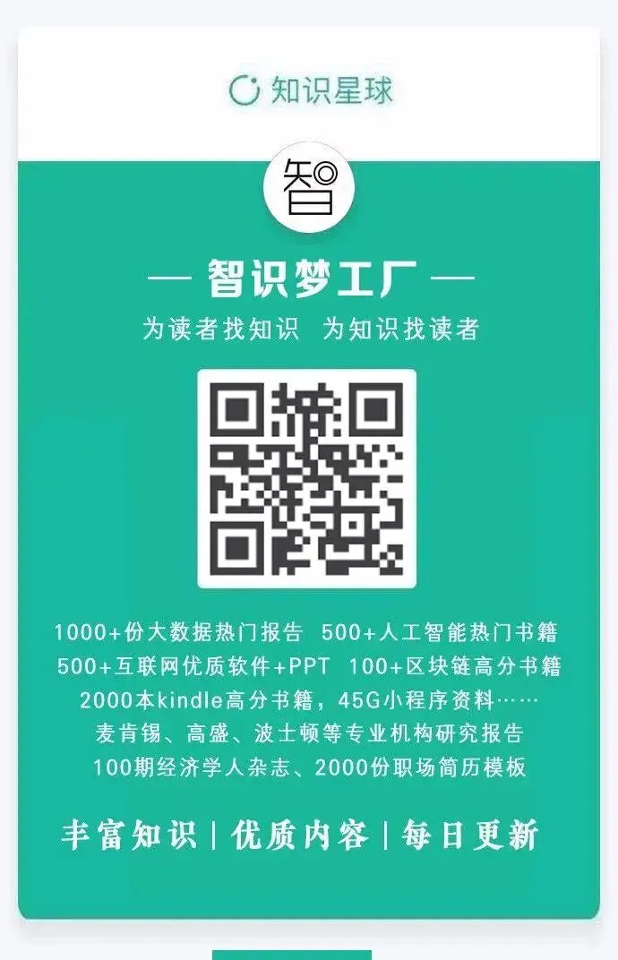 1000+份大数据热门报告 500+人工智能热门书籍 500+互联网优质软件+PPT 100+豆瓣高分书籍 2000本kindle高分书籍,45G小程序资料…… 麦肯锡、高盛、波士顿等机构研究报告 经济学人杂志、职场简历模板 为读者找知识,为知识找读者 原价50,优惠后只要20