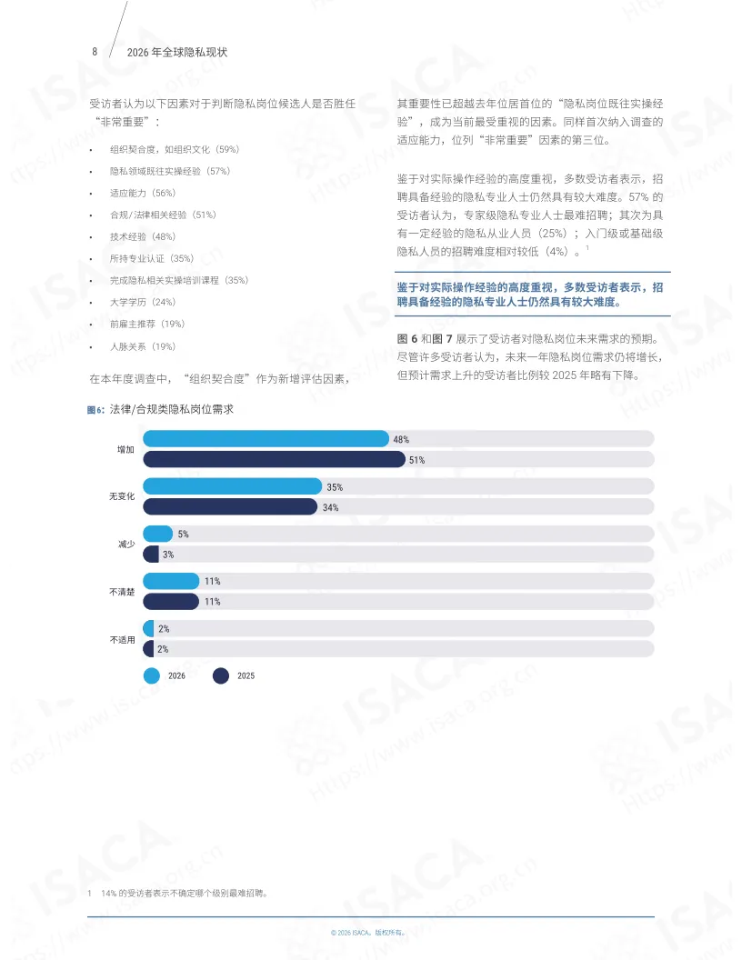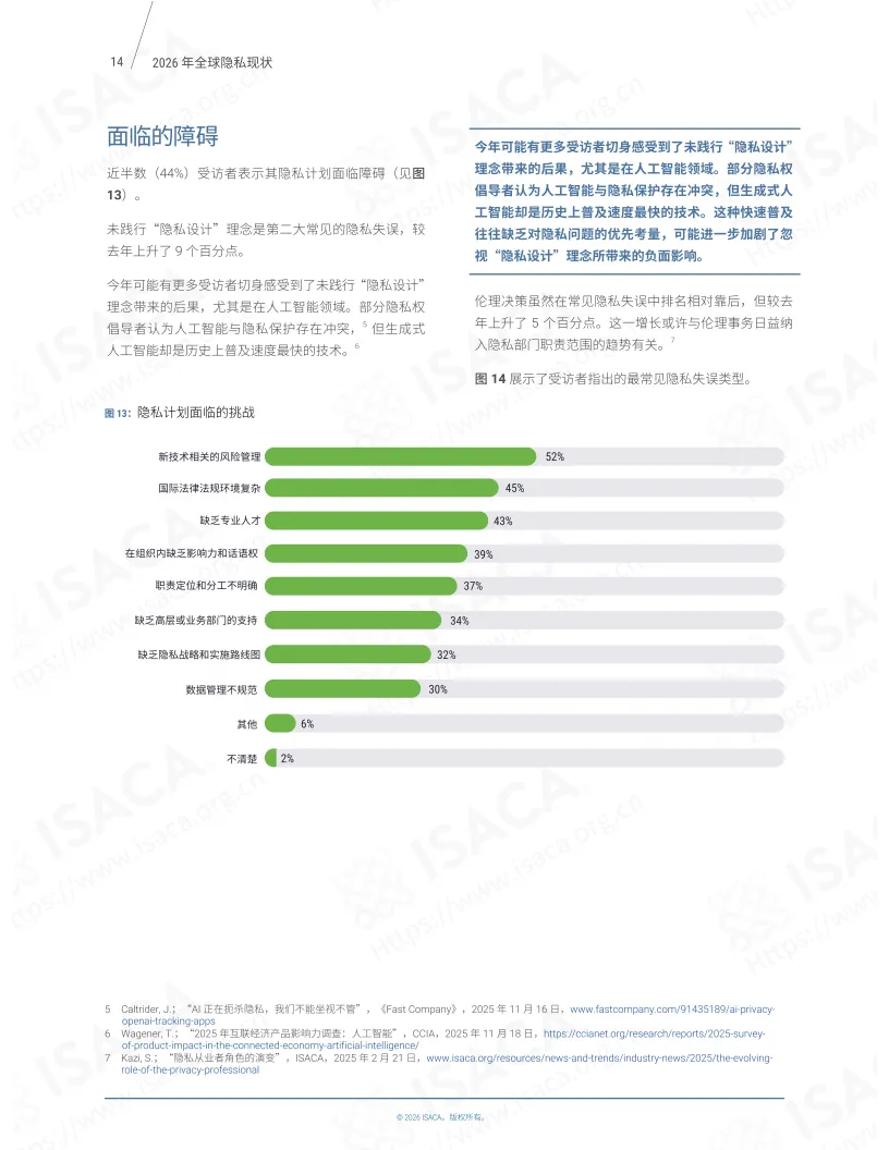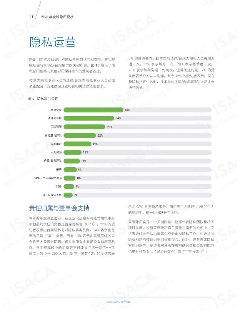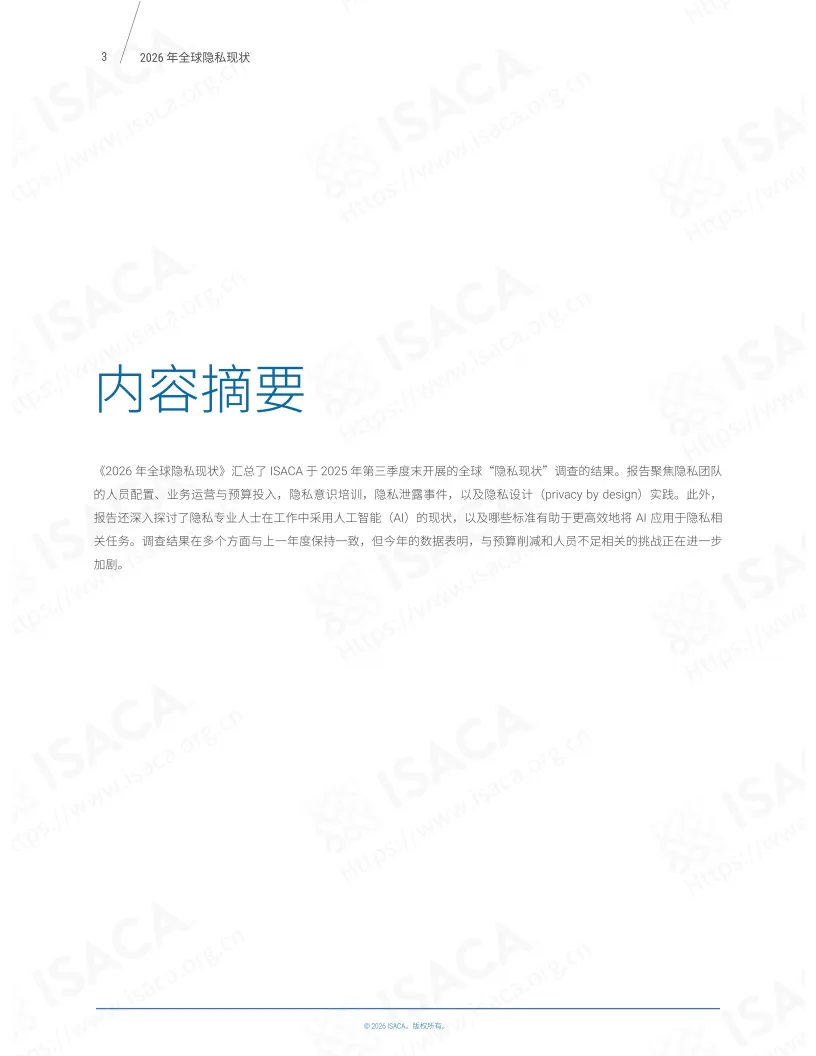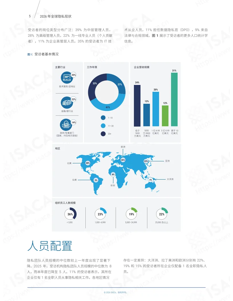 《2026年全球隐私现状》报告基于ISACA 2025年9月开展的第六次全球“隐私现状”年度调查,涵盖超1800名相关领域专业人士的反馈,聚焦隐私团队运营各关键维度,呈现了全球隐私管理领域的现状与趋势。