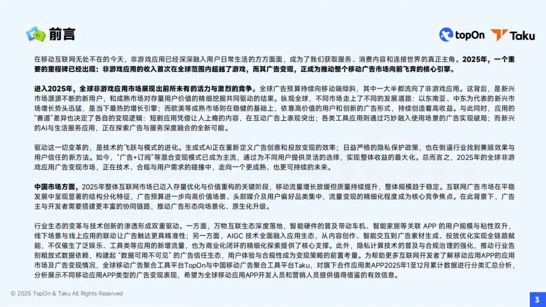 2025年,全球移动应用广告变现市场迎来重要变革,非游戏应用收入首次在全球范围内超越游戏,成为移动广告市场的核心增长引擎。全球广告预算持续向移动端倾斜,大半流向非游戏应用,新兴市场新用户增长与成熟市场存量用户价值挖掘共同驱动行业发展。