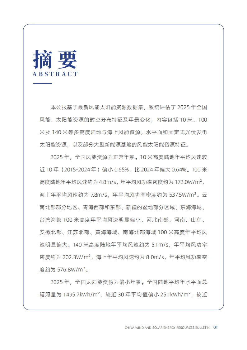 《2025年中国风能太阳能资源年景公报》由中国气象局风能太阳能中心、中国气象局能源气象重点开放实验室编制,系统评估了2025年全国风能、太阳能资源的时空分布特征及年景变化,涵盖多高度陆地与海上资源、光伏发电相关资源及部分大型新能源基地资源状况。