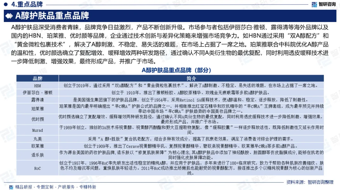 重点品牌:A醇护肤品深受消费者青睐,品牌竞争日益激烈,产品不断创新升级。市场参与者包括伊丽莎白·雅顿、露得清等海外品牌以及国内的HBN、珀莱雅、优时颜等品牌,企业通过技术创新与差异化策略来增强市场竞争力。