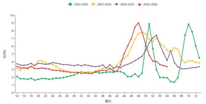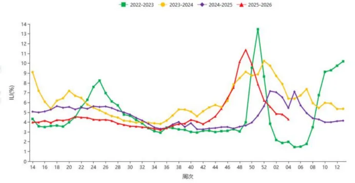 2026年第4周,北方省份哨点医院报告的ILI%为3.4%,低于前一周水平(3.5%),高于2023年同期水平(1.9%),低于2024年和2025年同期水平(5.2%和4.2%)。