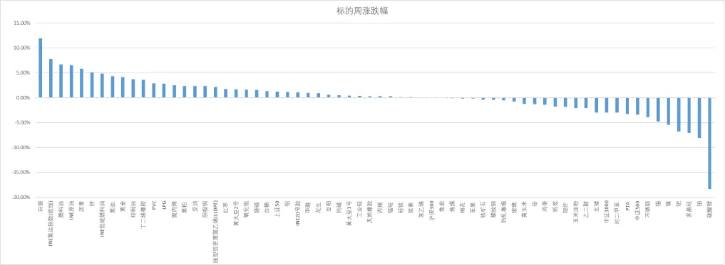 全周上涨超5%的商品(依次):白银、集运欧线、原油、沥青等;全周下跌超5%的商品(依次) 铂金、多晶硅、钯金和镍等。