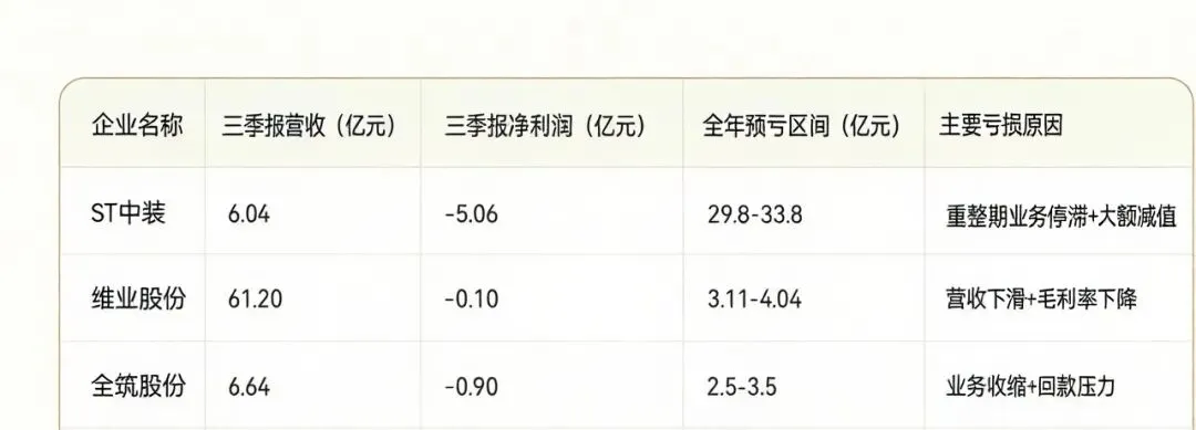 与此同时,超过十家公司预告2025年将出现亏损,ST中装预亏额高达29.8亿至33.8亿元,另有*ST建艺、维业股份、全筑股份等多家企业亏损过亿。