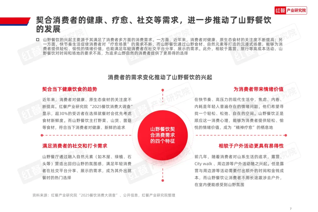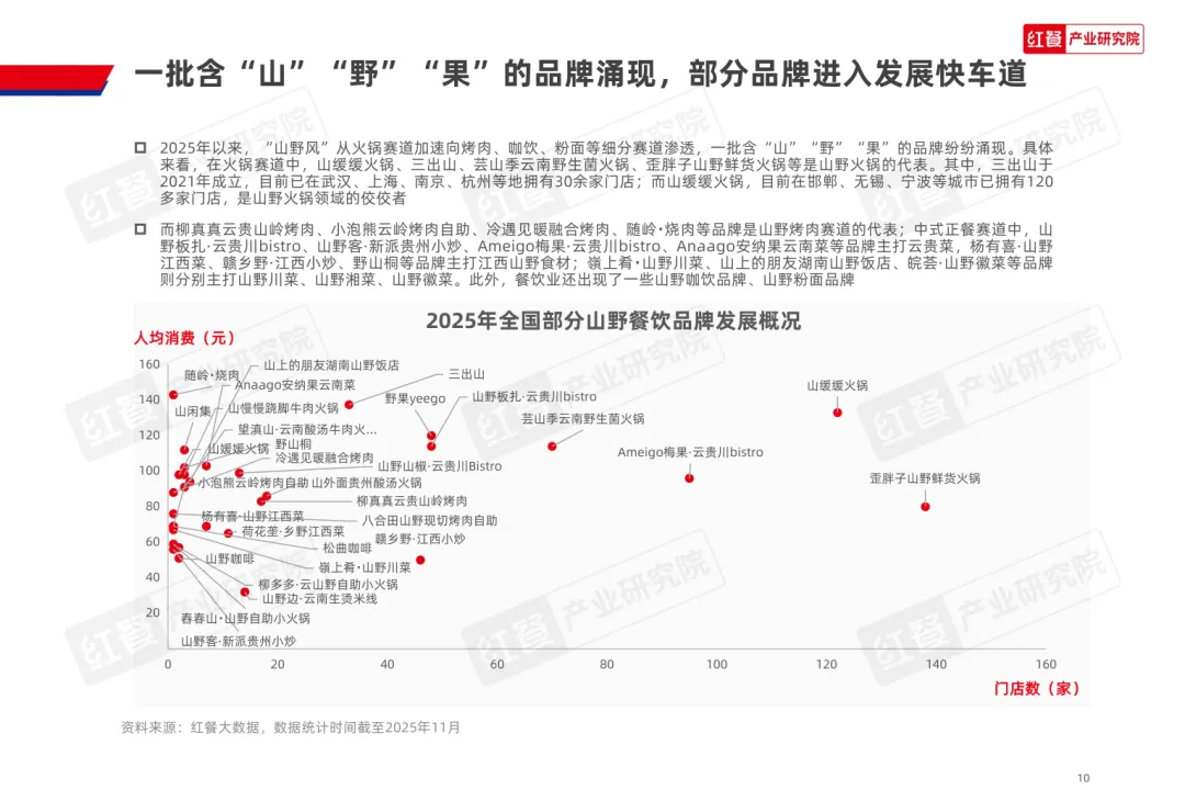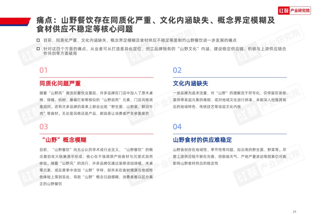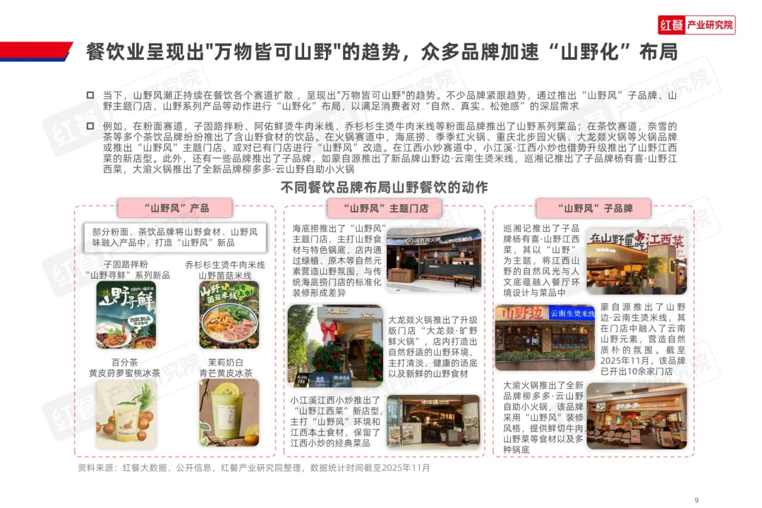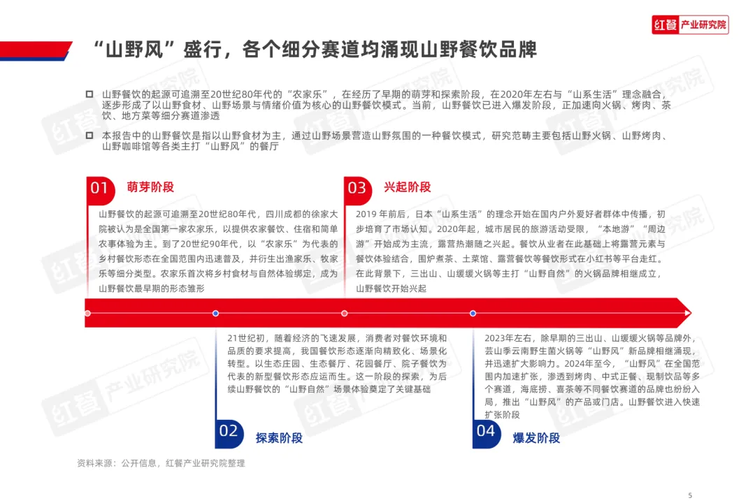 导读:山野餐饮起源于 20 世纪 80 年代的 “农家乐”,2020 年左右与 “山系生活” 理念融合,形成以山野食材、山野场景与情绪价值为核心的餐饮模式,当前已进入爆发阶段,正向火锅、烤肉、茶饮等多细分赛道渗透。其兴起契合消费者多元需求,健康原生态食材受青睐,沉浸式场景提供情绪疗愈,且相较于露营等活动更易实现,叠加供应链完善与冷链物流发展,为行业扩张奠定基础。众多品牌通过推出山野风产品、主题门店或子品牌布局市场,不同赛道品牌逐步形成特色,在食材、风味、场景设计上各有侧重。行业仍面临同质化严重、文化内涵缺失、概念界定模糊及食材供应不稳定等痛点。未来,创业者需理性入局明确定位,从业者需回归餐饮本质,通过持续创新与文化挖掘,将 “山野” 概念转化为可持续产品力,推动行业长期发展。