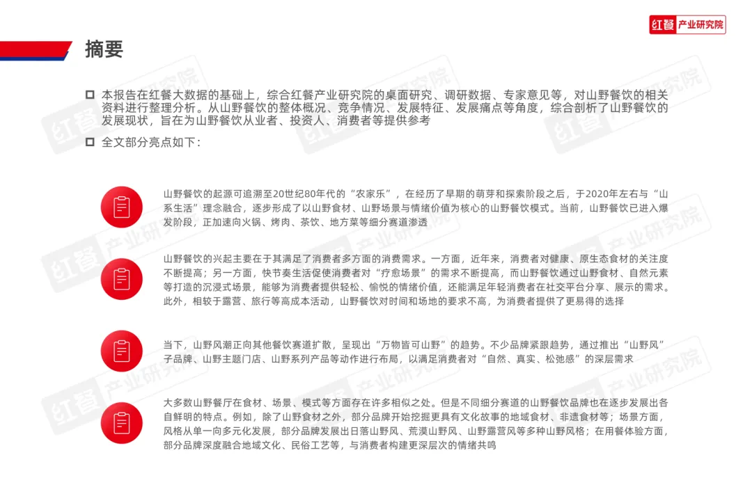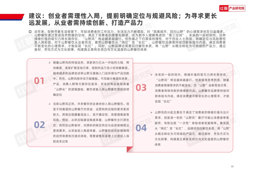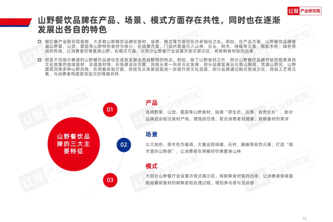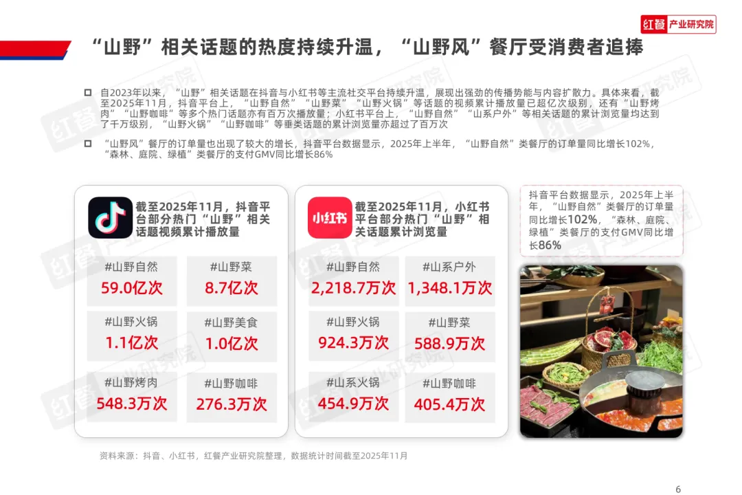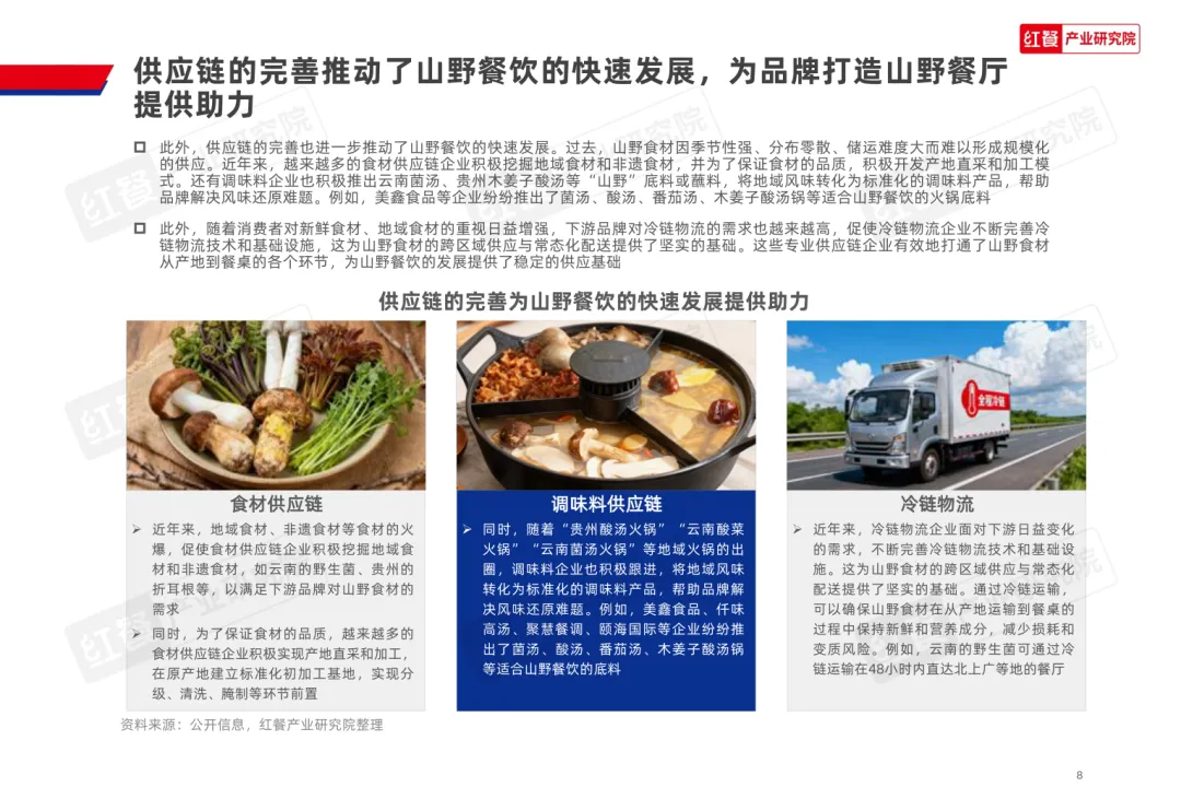 导读:山野餐饮起源于 20 世纪 80 年代的 “农家乐”,2020 年左右与 “山系生活” 理念融合,形成以山野食材、山野场景与情绪价值为核心的餐饮模式,当前已进入爆发阶段,正向火锅、烤肉、茶饮等多细分赛道渗透。其兴起契合消费者多元需求,健康原生态食材受青睐,沉浸式场景提供情绪疗愈,且相较于露营等活动更易实现,叠加供应链完善与冷链物流发展,为行业扩张奠定基础。众多品牌通过推出山野风产品、主题门店或子品牌布局市场,不同赛道品牌逐步形成特色,在食材、风味、场景设计上各有侧重。行业仍面临同质化严重、文化内涵缺失、概念界定模糊及食材供应不稳定等痛点。未来,创业者需理性入局明确定位,从业者需回归餐饮本质,通过持续创新与文化挖掘,将 “山野” 概念转化为可持续产品力,推动行业长期发展。