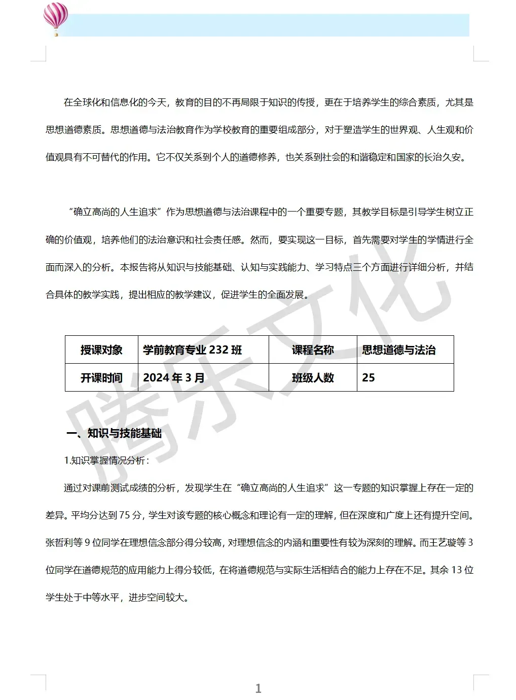 以“思想道德与法治”课程为例,选择专题为“确立高尚的人生追求”的学情分析报告案例具体如下: