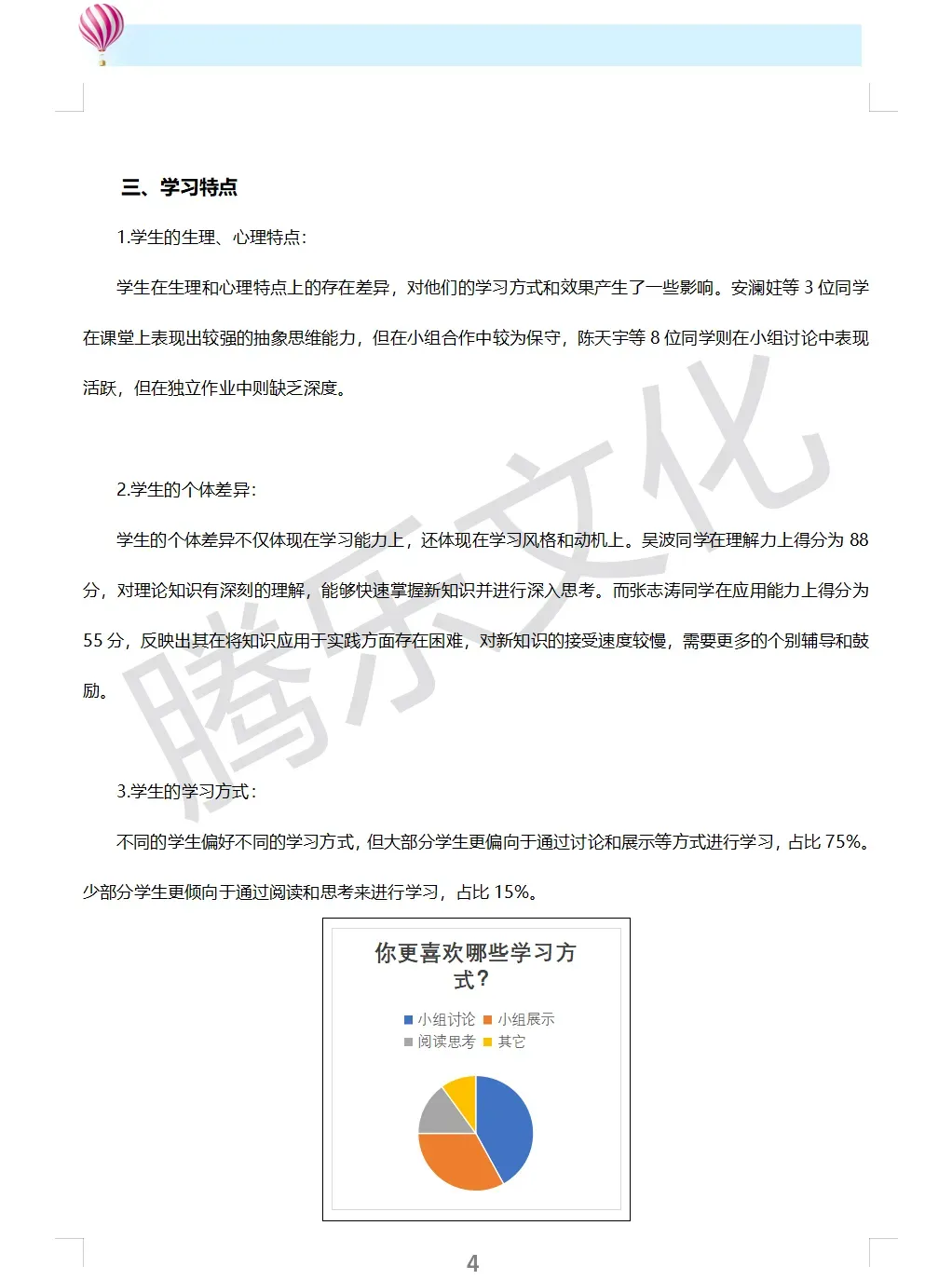 学习特点主要是从学生本身出发,比如学生的兴趣点、学生的生理心理状况、学生个性、学生的学习动机、学习方式、学习时间、学习效果,学生的生活环境等方面。具体可从以下2点进行分析:
