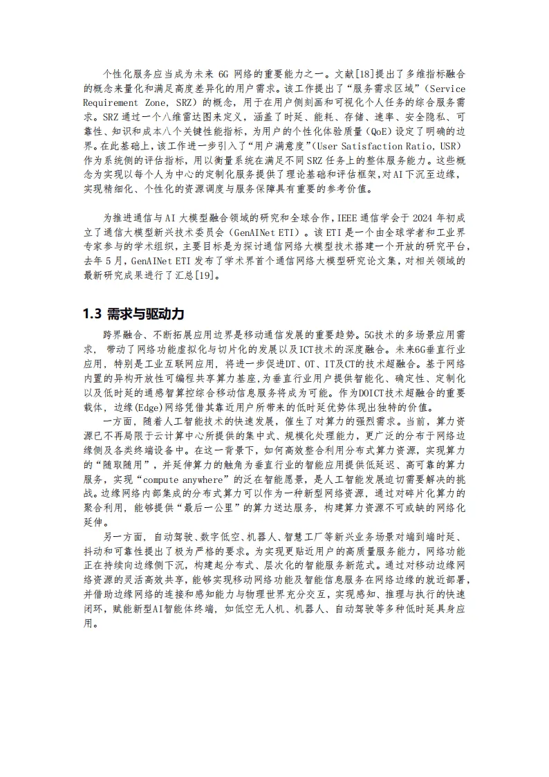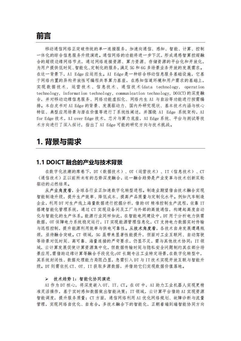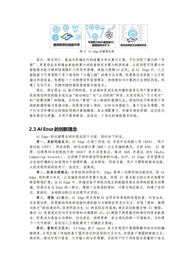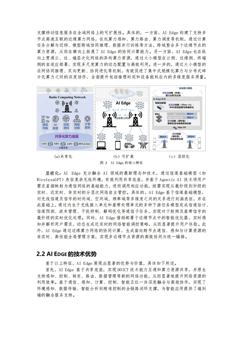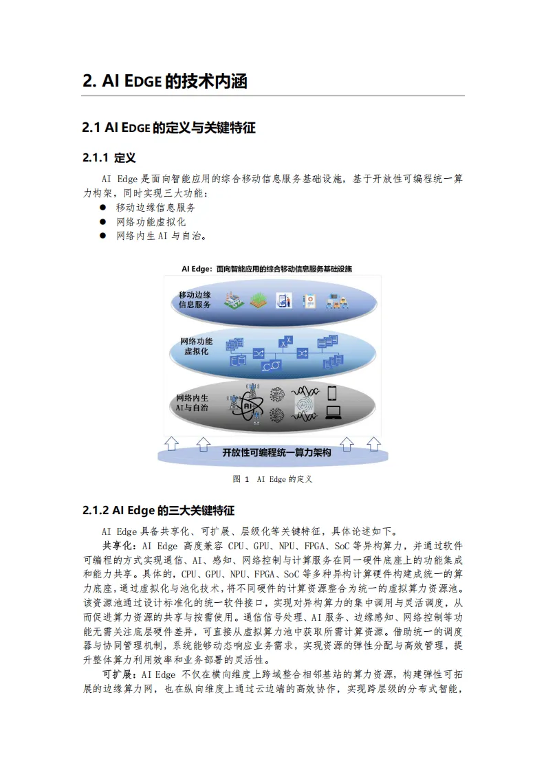 AI Edge是基于网络内置异构开放性可编程共享算力基座,实现DOICT深度融合的综合移动信息服务基础设施,为5G和6G多场景业务提供低时延、智能化、定制化服务,是移动通信网络向通信、感知、智能、计算、控制一体化升级的关键载体。