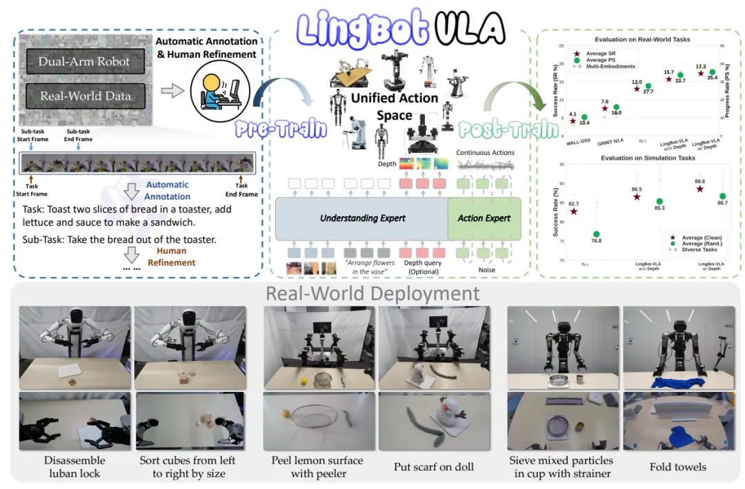 - 蚂蚁灵波开源具身智能基座模型LingBot-VLA,基于20000小时真实世界机器人操作数据训练,性能超越国际顶尖模型。该模型采用专家混合Transformer架构,结合深度感知技术,能让机器人在不同环境和机型上完成复杂任务,如收纳、餐具清洁整理等,还验证了VLA模型性能随数据规模扩大而提升的Scaling Law。