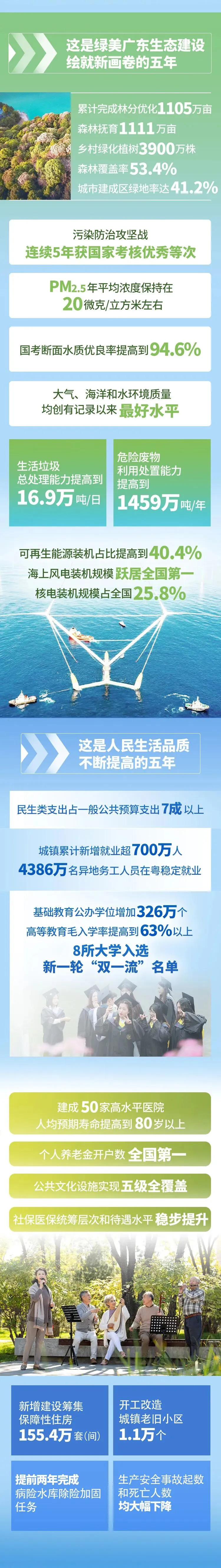 这是人民生活品质不断提高的五年。实施“民生十大工程”,民生类支出占一般公共预算支出7成以上,居民人均可支配收入五年增长30.8%。城镇累计新增就业超700万人、约占全国1/10,4386万名异地务工人员在粤稳定就业。基础教育公办学位增加326万个,高等教育毛入学率从53.4%提高到63%以上,8所大学入选新一轮“双一流”名单,省职教城(清远)初具规模,本科高校、高职院校、技师学院均实现21个地级以上市全覆盖。建成50家高水平医院,人均预期寿命提高到80岁以上。建成老年助餐点3897个并有序向各年龄段开放,个人养老金开户数全国第一。文化及相关产业增加值稳居全国首位,一批文艺精品力作获国家级奖项,广州国家版本馆、白鹅潭大湾区艺术中心等标志性文化设施建成使用,公共文化设施实现五级全覆盖,建成新时代文明实践中心(所、站)2.8万个,潮州入选国家文物保护利用示范区。广东健儿在国内外体育赛场上屡获佳绩,全民健身公共服务体系不断完善。职工医保参保人数突破5100万,社保医保统筹层次和待遇水平稳步提升,职业伤害保障试点覆盖696万名新业态劳动者,药品价格合理回归,社会救助标准进一步提高。建设筹集保障性住房155.4万套(间),开工改造城镇老旧小区1.1万个。建成珠三角水资源配置工程、韩江榕江练江水系连通工程,提前两年完成病险水库除险加固任务。生产安全事故起数和死亡人数均大幅下降,社会治安形势持续向好。国防动员、优抚安置、双拥共建等工作取得新成效,民族宗教、工会、共青团、妇女儿童、残疾人、参事文史、信访、地方志、档案、地质、地震、气象等工作全面进步。