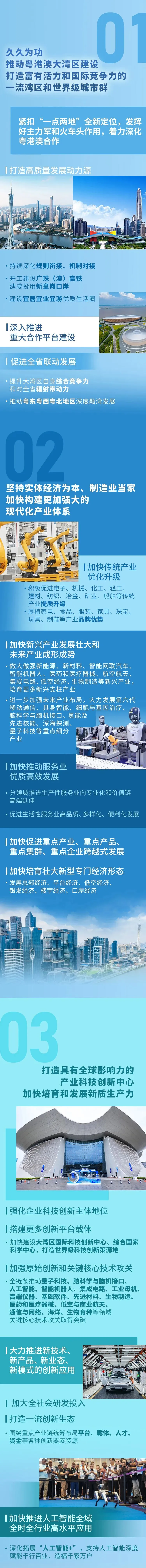 (一)久久为功推动粤港澳大湾区建设,打造富有活力和国际竞争力的一流湾区和世界级城市群。服务“一国两制”大局,紧扣新发展格局的战略支点、高质量发展的示范地、中国式现代化的引领地“一点两地”全新定位,发挥好主力军和火车头作用,着力深化粤港澳合作,携手建设世界级的大湾区、发展最好的湾区。