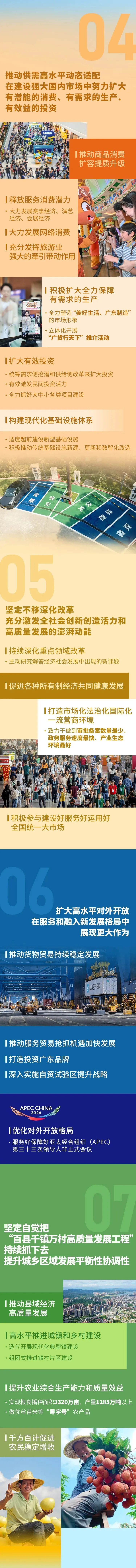优化对外开放格局。深度融入共建“一带一路”,积极对接西部陆海新通道,加快中欧班列广州集结中心、深圳节点城市建设,拓展国际海运航线网络,加快汕头、湛江临港经济区建设。健全海外综合服务体系,推动境外经贸合作区拓展功能,引导产业链供应链合理有序跨境布局,培育更多源自广东、总部在广东的跨国公司。促进各市高标准建设国际一流的出入境、住宿、饮食、交通、游览、消费、医疗等全场景全链条服务体系,完善多语种标识、便捷化支付等服务,营造宾至如归的国际化环境。服务好保障好亚太经合组织(APEC)第三十三次领导人非正式会议,吸引集聚更多国际高端要素,积极促进全省有更多开放成果和合作成果。