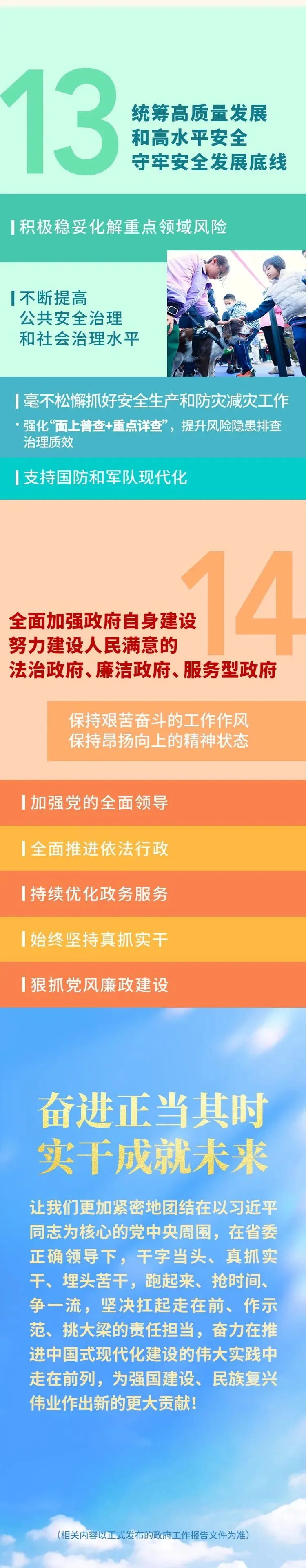 (十四)全面加强政府自身建设,努力建设人民满意的法治政府、廉洁政府、服务型政府。全省各级政府要增强大局观和执行力,保持艰苦奋斗的工作作风,保持昂扬向上的精神状态,持续提升政府工作水平。