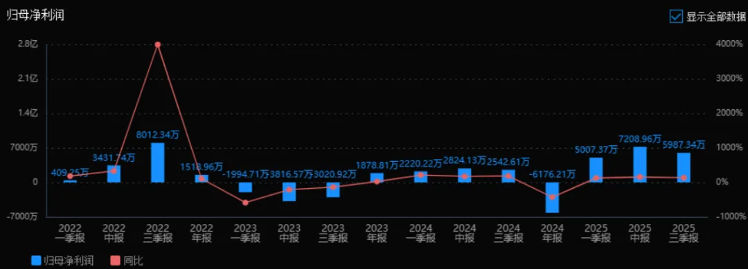 2025年三季度的归母净利润为5987.34万元,相较于2024年三季度的2542.61万元,同比增长135.48%。评价: 净利润实现翻倍以上增长,盈利能力强,扭转了2024年全年亏损的局面,经营效益明显改善。