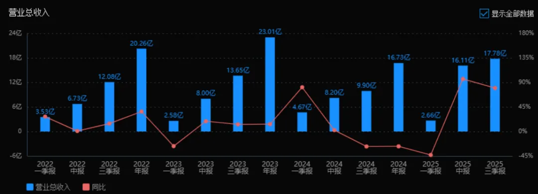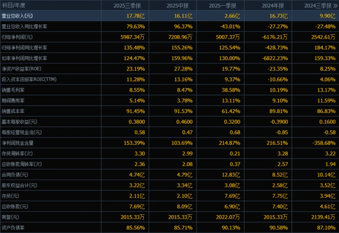 2025年三季度的营业总收入为17.78亿元,相较于2024年三季度的9.90亿元,同比增长79.63%。评价: 收入规模大幅提升,表明公司业务扩张或市场回暖效果显著,成长性表现突出。