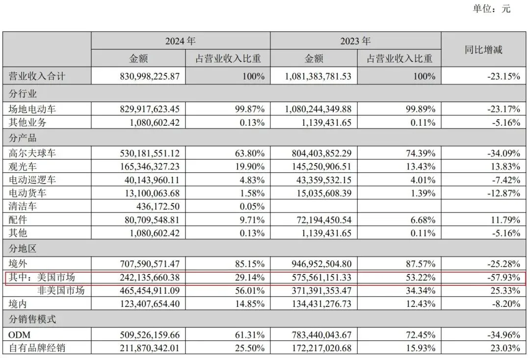 每经记者查询发现,美国市场原是绿通科技产品最主要的销售去向,2023年在美国市场实现的营收占比达到53.22%。但自2024年7月美国商务部对进口自中国的特定低速载人车辆发起“双反”调查以来,作为强制应诉企业之一,绿通科技在美国市场的销售便持续承压。2024年,绿通科技美国市场收入占比骤降至29.14%。