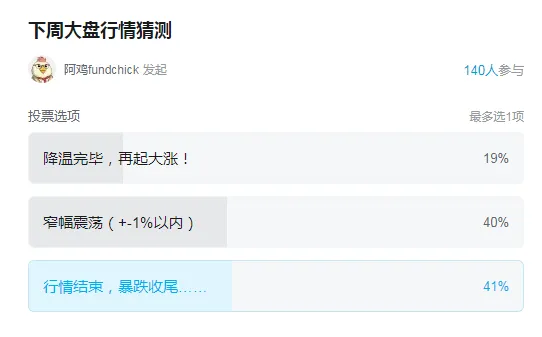 本周投票中,随着GJD持续的大力抛售,市场情绪依然谨慎为主。叠加有色股的冲高暴跌,看多的人已经萎缩到不足20%了。周五也罕见发现监管没再天量抛售了,可能看到市场降温在即,也就完成任务了。不过,看成交量也依然在一个比较高的位置(大概2.8-3万亿),这个绝对数额还是很大的。即,追涨的情绪较此前明显降温了,但其实市场交投依然热烈。