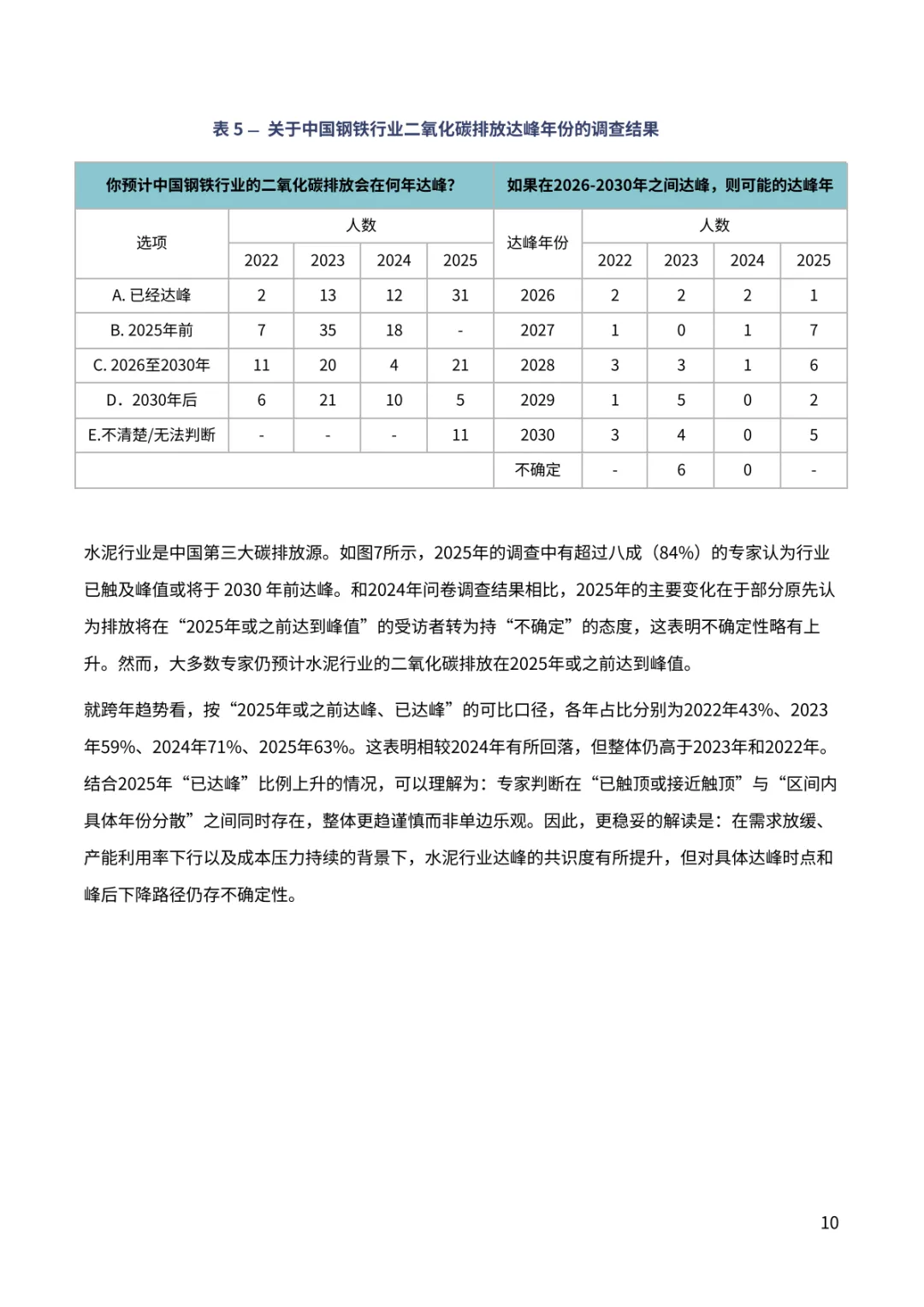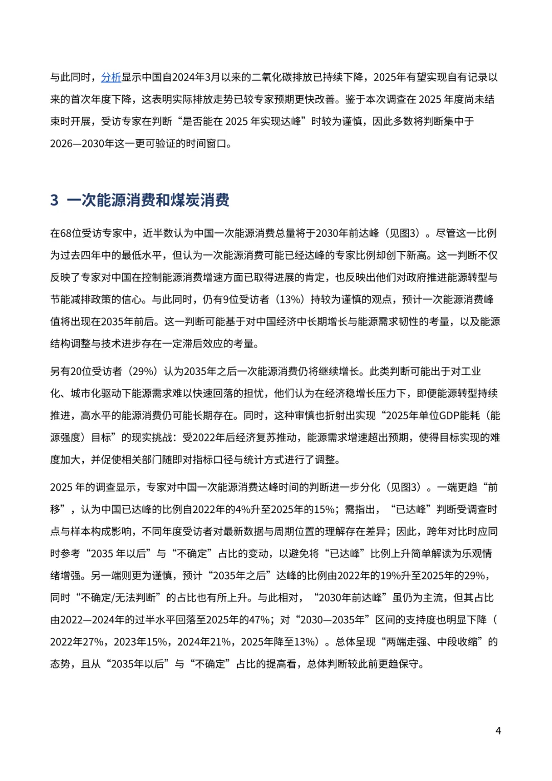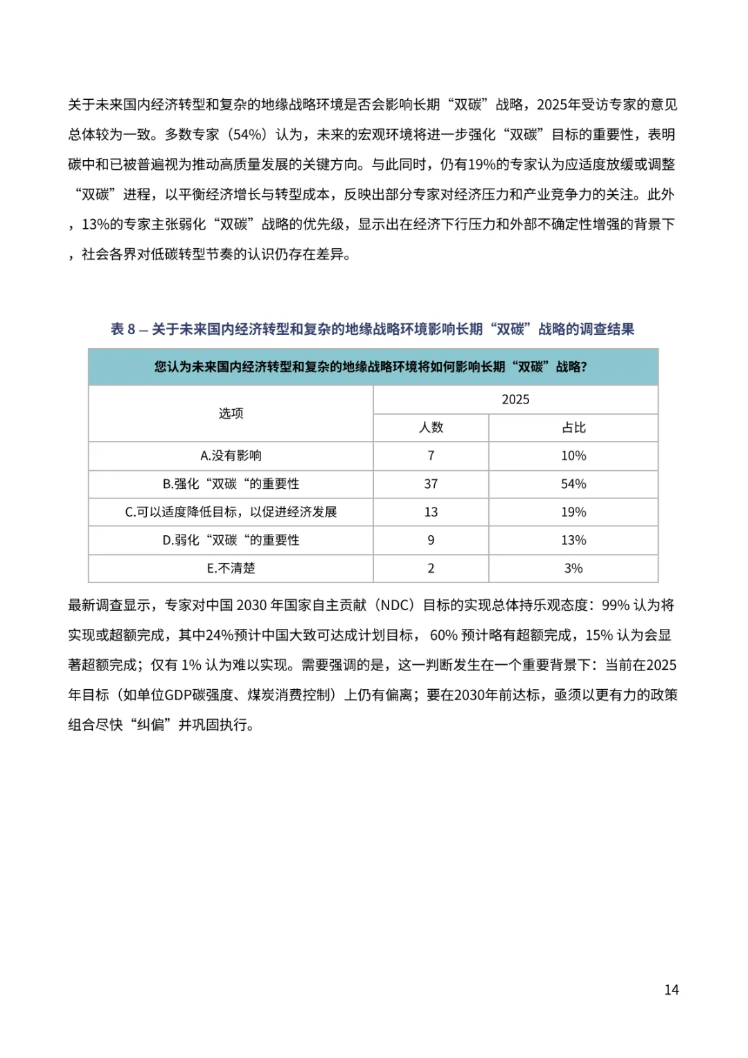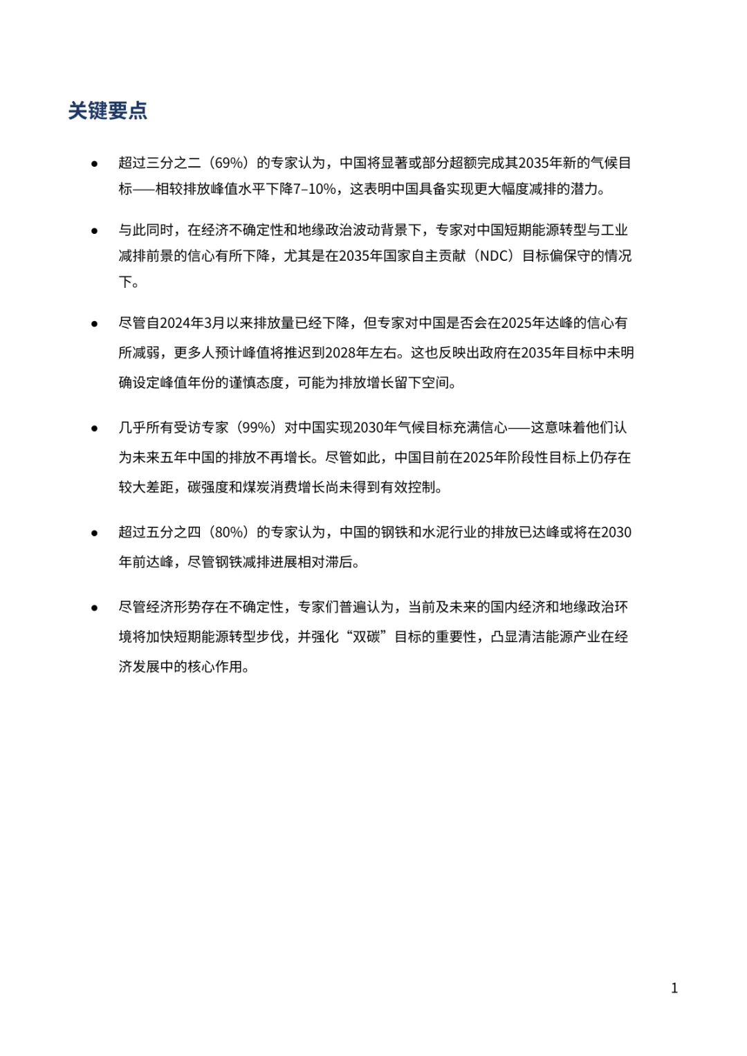 报告聚焦中国 “双碳” 进程关键趋势。超九成专家对中国 2030 年气候目标实现充满信心,近七成认为 2035 年新气候目标将显著或部分超额完成,彰显长期减排潜力。排放达峰预期呈现新变化,88% 专家看好 2030 年前达峰,多数指向 2026-2030 年区间,2028 年成为热门预判年份。钢铁、水泥行业超八成专家认为已达峰或 2030 年前达峰,交通部门 60% 专家预计 2030 年前达峰,新能源汽车高渗透率成为重要支撑。能源消费领域,近半数专家认为一次能源消费 2030 年前达峰,煤炭消费达峰与否分歧接近,44% 认为已达峰。经济与地缘环境下,56% 专家认为将加快短期能源转型,54% 认为会强化 “双碳” 目标重要性。当前 2025 年阶段性目标仍存差距,碳强度与煤炭消费增长控制需强化政策执行。
