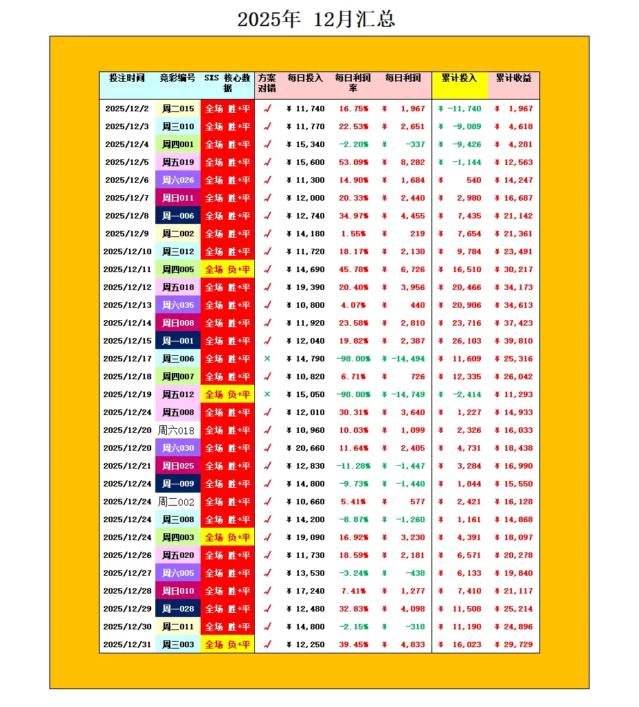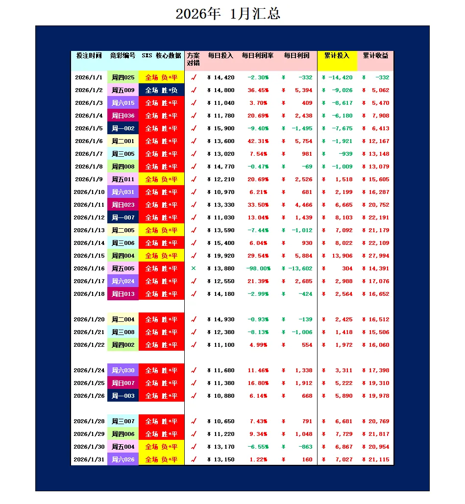 2026年1月,SXS赛事数据分析系统坚守价值投资核心原则,在复杂市场环境中持续兑现稳定收益承诺,用数据印证“价值为锚、长期制胜”的投资逻辑。本月累计完成28场赛事分析推荐,命中27场,胜率高达96.43%,核心数据表现超越行业平均水准;从资金运作维度看,全月累计投入14420元,实现累计收益21115元,原始盈利率达146.42%;若采用金融投资领域标准的量化仓位管理策略,按单次投入金额1/10的比例执行交易,月化收益率稳定在14%左右,完全符合价值投资“稳定复利、风险可控”的预设目标。